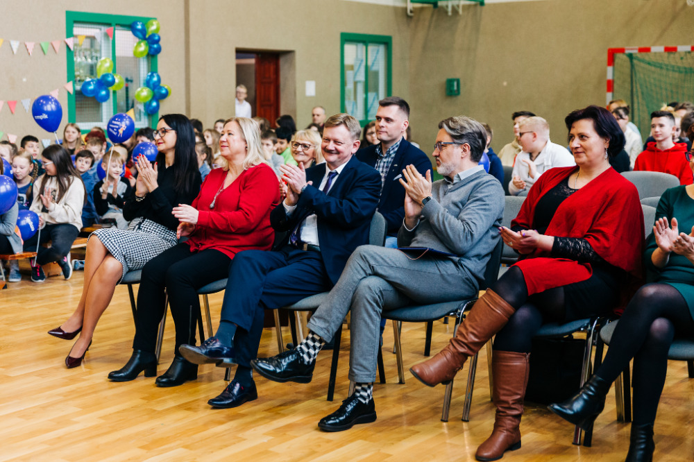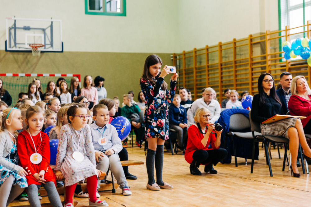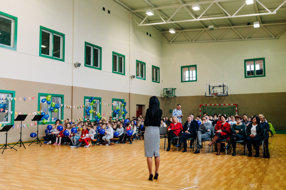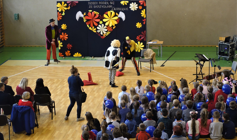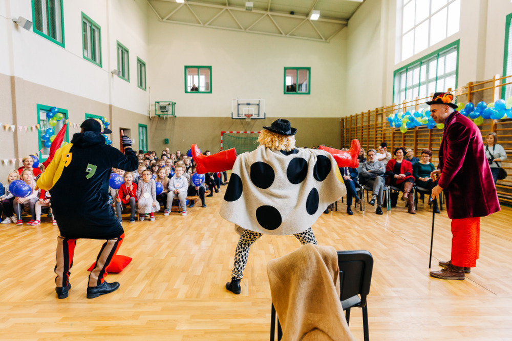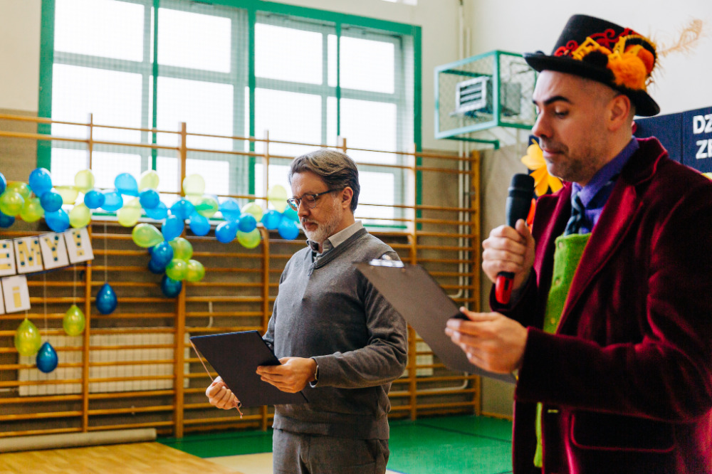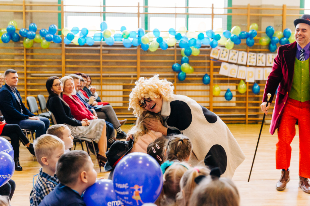 Po przedstawieniu głos zabrała pani Katarzyna Brzuzy, dyrektor Publicznej Szkoły Podstawowej im. Papieża Jana Pawła II z Publicznym Przedszkolem w Młynarzach. Przywitała wszystkich obecnych, a szczególnie gości – ekipę Empiku oraz przedstawicieli władz lokalnych: pana Adama Rupińskiego, Wójta Gminy Młynarze, panią Elżbietę Dzwonkowską, sekretarz Gminy Młynarze, panią Marzenę Tarasiewicz, Skarbnik Gminy Młynarze oraz panią Elżbietę Suchecką, kierownik Gminnej Biblioteki Publicznej w Młynarzach, a także panią Annę Majkowską- Falbę, przewodniczącą Rady Rodziców PSP im. Papieża Jana Pawła II z PP w Młynarzach.