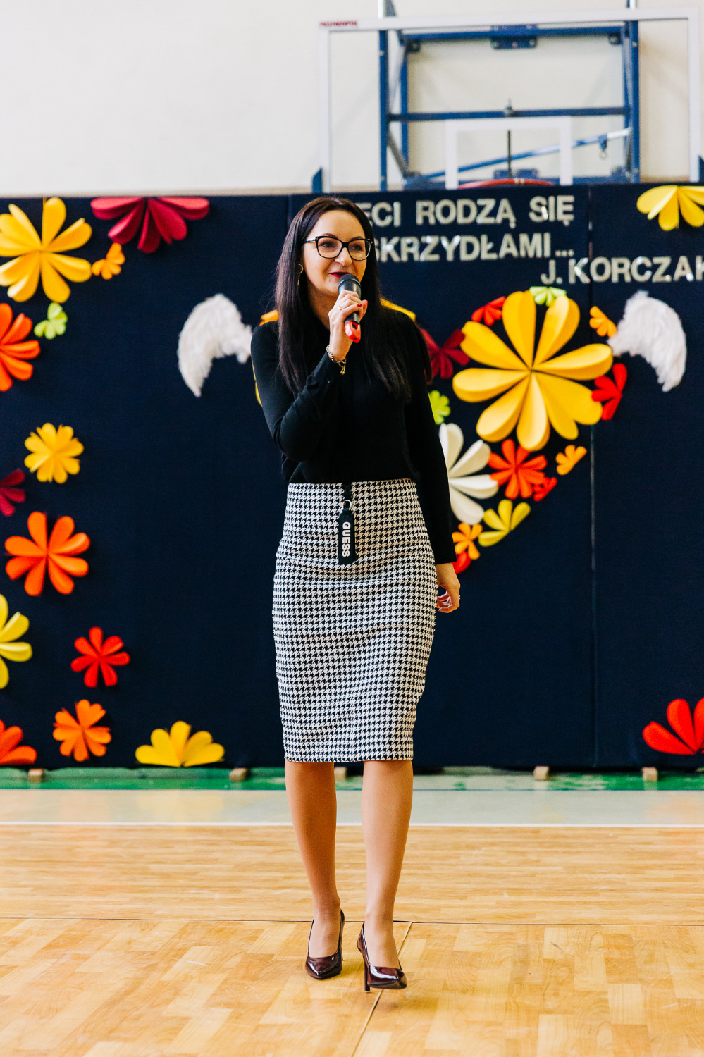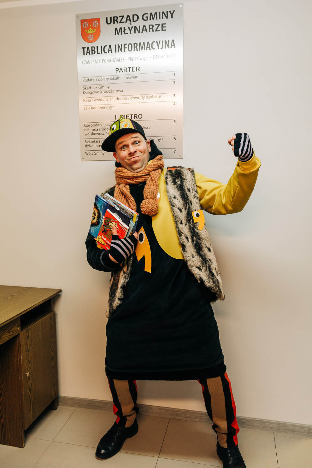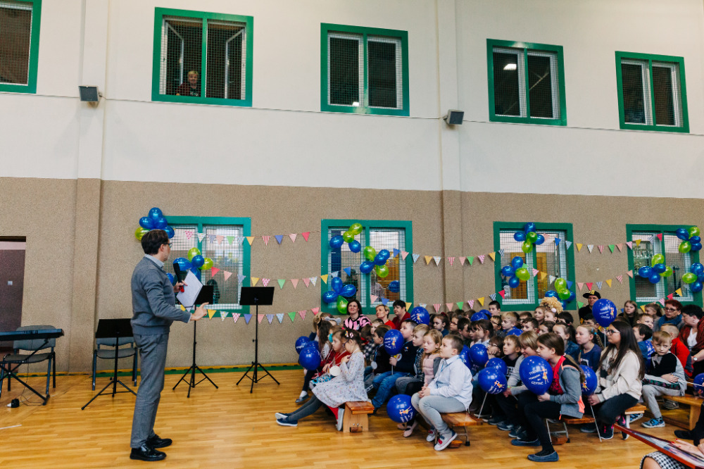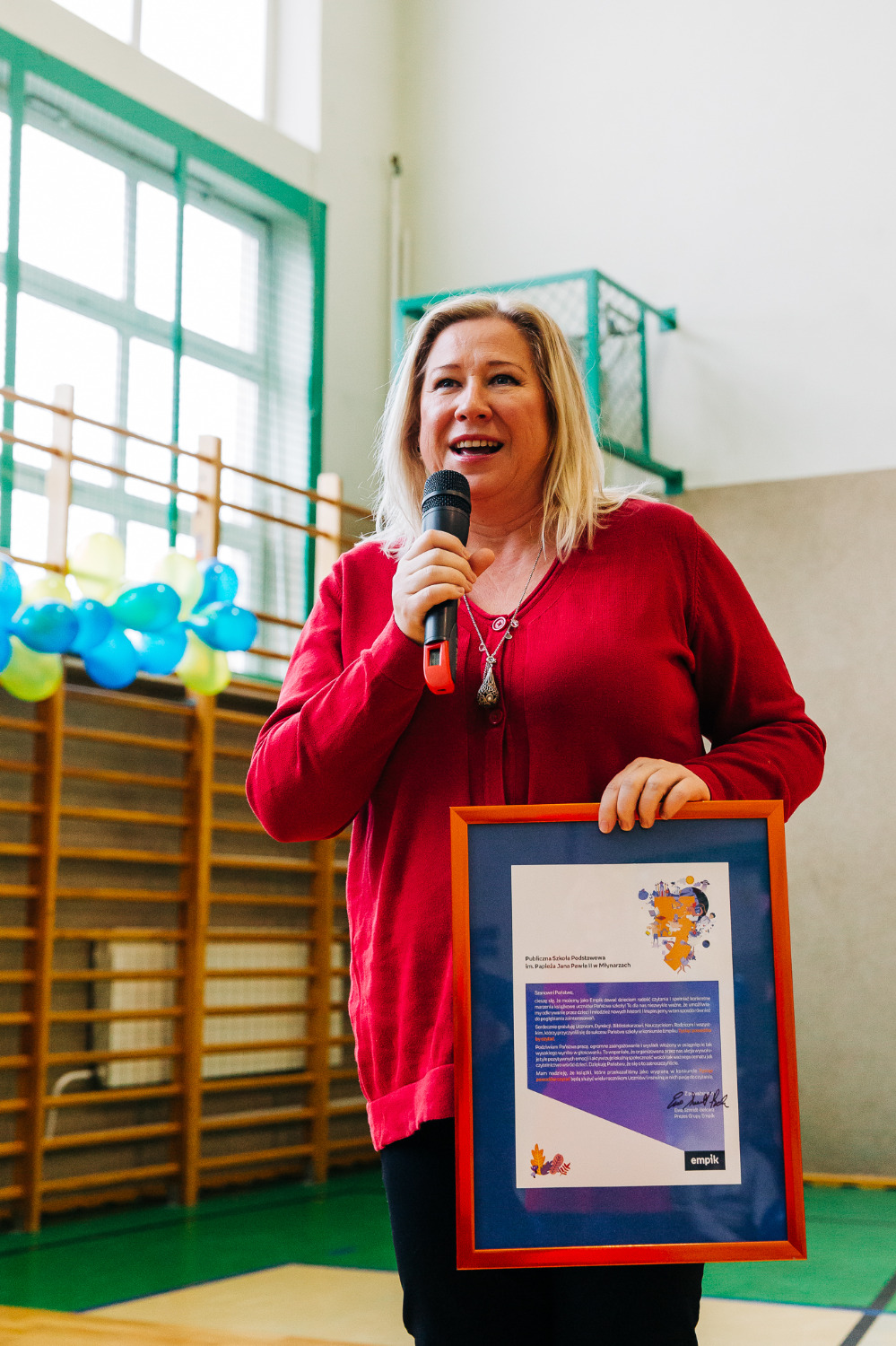 Po przedstawieniu głos zabrała pani Katarzyna Brzuzy, dyrektor Publicznej Szkoły Podstawowej im. Papieża Jana Pawła II z Publicznym Przedszkolem w Młynarzach. Przywitała wszystkich obecnych, a szczególnie gości – ekipę Empiku oraz przedstawicieli władz lokalnych: pana Adama Rupińskiego, Wójta Gminy Młynarze, panią Elżbietę Dzwonkowską, sekretarz Gminy Młynarze, panią Marzenę Tarasiewicz, Skarbnik Gminy Młynarze oraz panią Elżbietę Suchecką, kierownik Gminnej Biblioteki Publicznej w Młynarzach, a także panią Annę Majkowską- Falbę, przewodniczącą Rady Rodziców PSP im. Papieża Jana Pawła II z PP w Młynarzach.