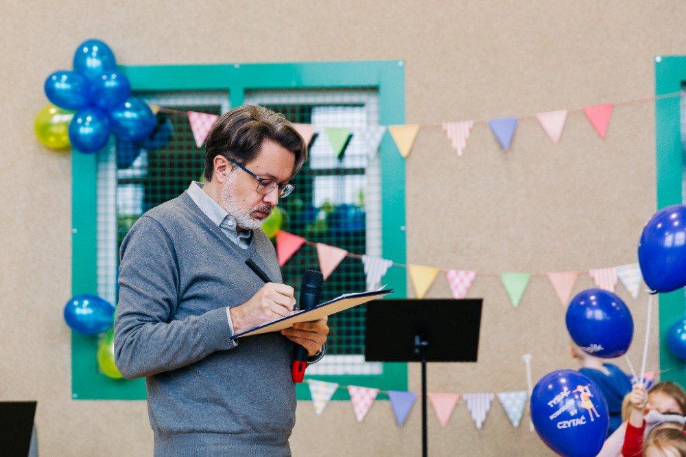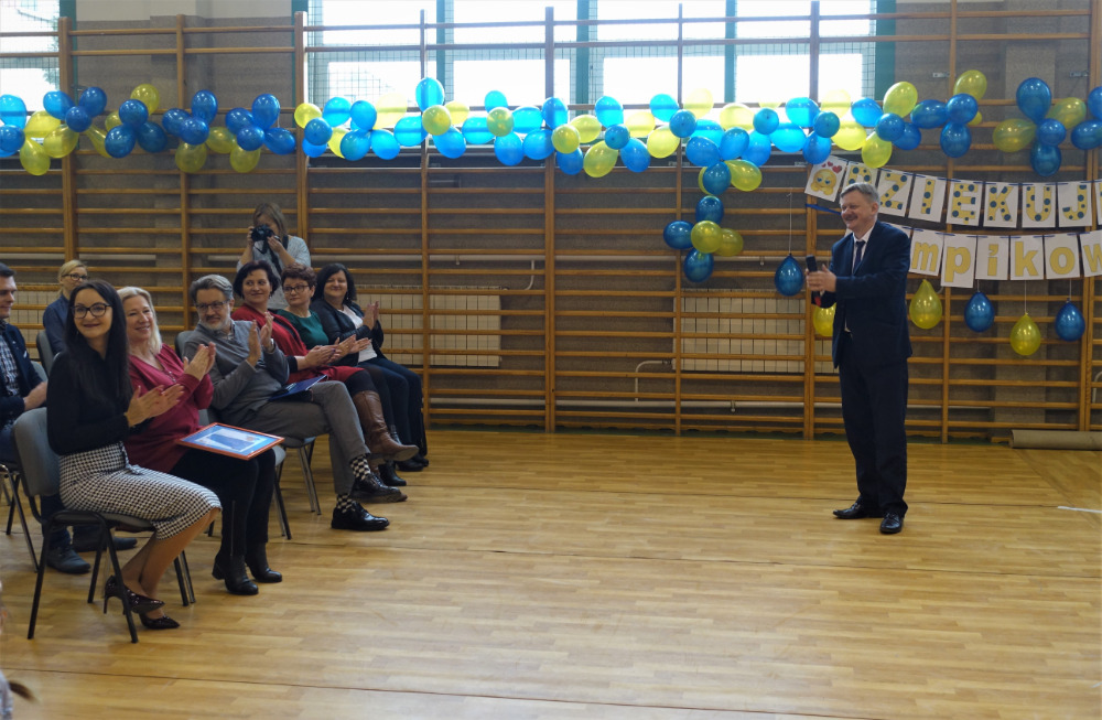 Następnie z krótkim przemówieniem na temat roli książek w naszym życiu wystąpił pan wójt, Adam Rupiński. Podziękował organizatorom za nagrodę, ale też za zorganizowanie całej akcji, która, promując czytelnictwo, przyczyniła się również do integracji naszej lokalnej społeczności. Wyraził wdzięczność wszystkim, którzy głosowali na naszą szkołę.