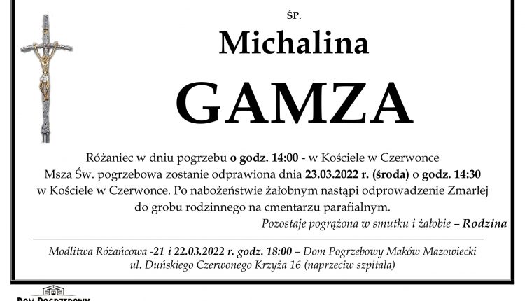 Różaniec w dniu pogrzebu o godz. 14:00 – w Kościele w Czerwonce. Msza Św. pogrzebowa zostanie odprawiona dnia 23.03.2022 r. (środa) o godz. 14:30 w Kościele w Czerwonce. Po nabożeństwie żałobnym nastąpi odprowadzenie Zmarłej do grobu rodzinnego na cmentarzu parafialnym. Pozostaje pogrążona w smutku i żałobie – Rodzina