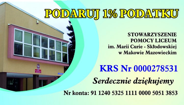 W związku z powyższym zwracamy się do Państwa z prośbą o wsparcie finansowe poprzez przekazanie 1% w deklaracjach podatkowych za 2021 rok na Stowarzyszenie Pomocy Liceum Ogólnokształcącego im. Marii Curie-Skłodowskiej w Makowie Mazowieckim wpisując KRS 0000278531.