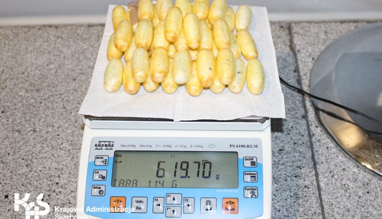 Funkcjonariusze Działu Granicznego Realizacji Mazowieckiego Urzędu Celno-Skarbowego (MUCS) pełniący służbę na  Lotnisku  Chopina w Warszawie, wytypowali do kontroli celnej 36-letniego obywatela Nigerii z kartą pobytu Rzeczypospolitej Polskiej. Uwagę funkcjonariuszy zwrócił kierunek przylotu z kraju podwyższonego ryzyka przemytu narkotyków (Gujana Francuska) oraz nerwowe zachowanie podróżnego.