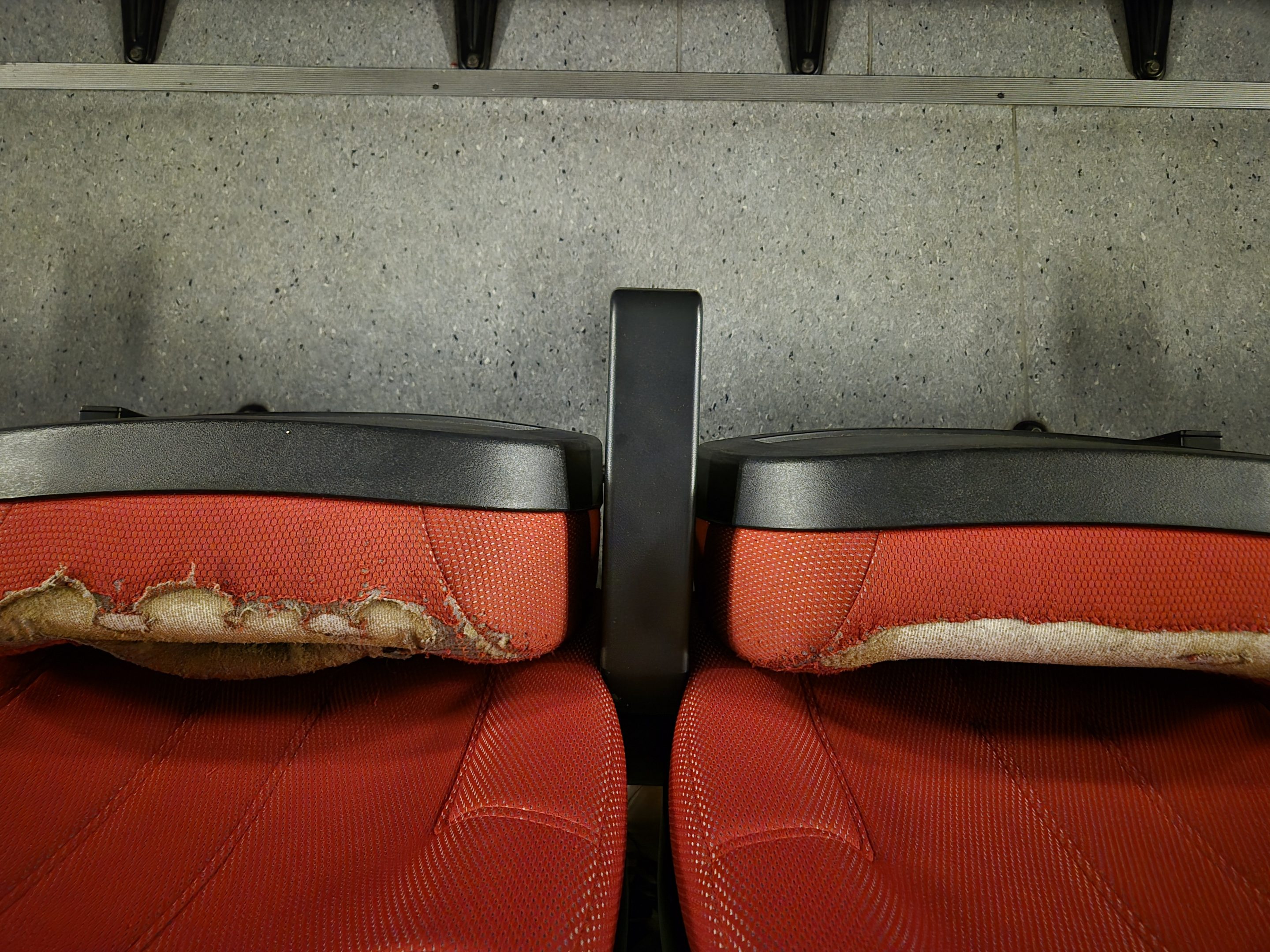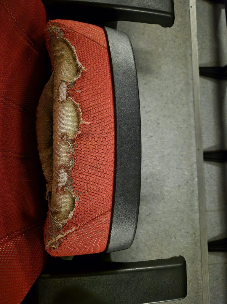 Użytkownik, który przesłał zapytanie, podkreśla, że fotele mają około 10 lat i widać na nich wyraźne ślady zużycia. Na załączonych fotografiach widoczne są rozdarte obicia w kolorze czerwonym, z wystającą gąbką i materiałem pod spodem. Taki widok, zdaniem mieszkańca, nie tylko psuje estetykę sali, ale także może wpływać na higienę i wygodę podczas seansów.