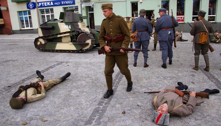 Następnie na nowo otwartym Rynku Miejskim odbyły się pokazy opancerzonych pojazdów z epoki oraz broni używanej przed stu laty. Uczestnicy wydarzenia mieli możliwość obejrzeć czołg Renault FT i samochód pancerny WNUK,. Pojazdy te wzięły udział (po stronie polskiej) w rekonstruowanej potyczce z okresu wojny polsko-bolszewickiej. Zaprezentowano także  opancerzony pojazd Russo-Bałt, który w walce wspierał bolszewików.