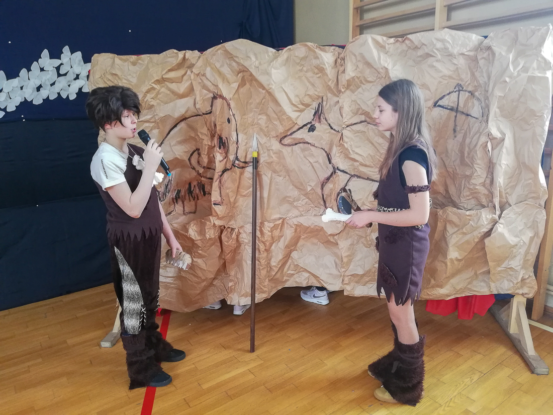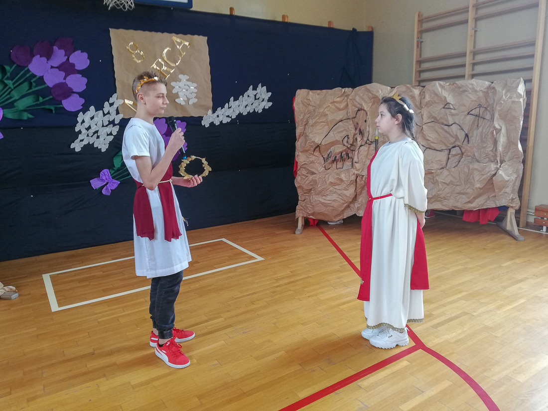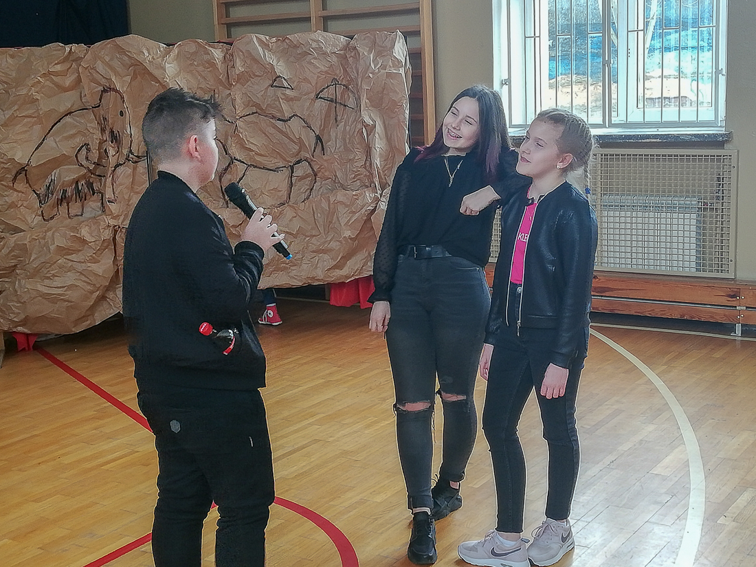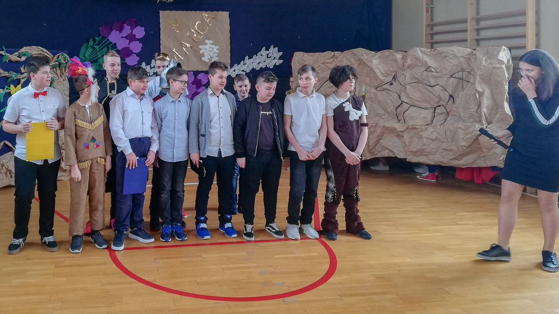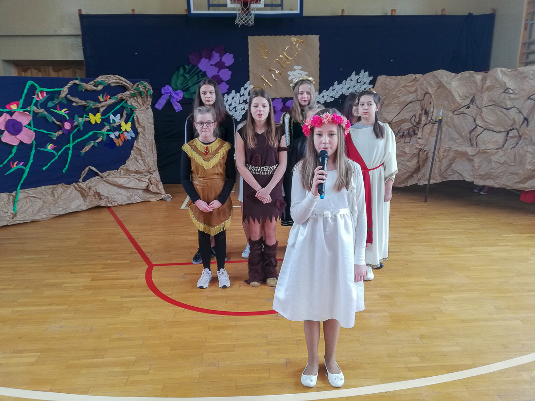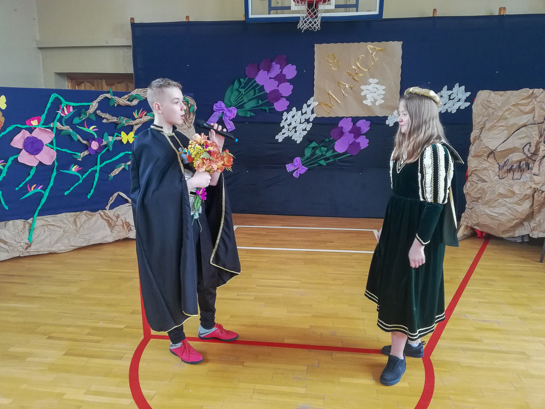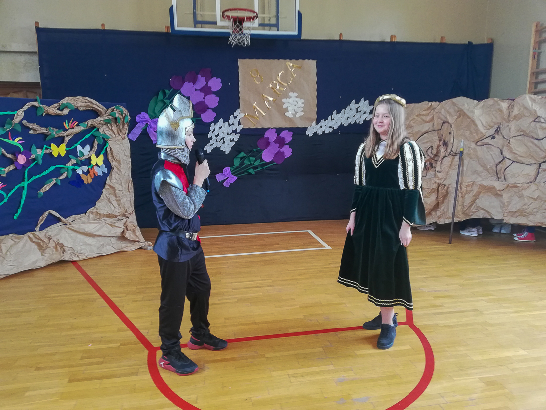 Uczniowie starszych klas obejrzeli akademię przygotowaną przez uczniów klasy VI b pod kierunkiem Iwony Ostrowskiej i dowiedzieli się, jak obchodzono Dzień Kobiet w różnych epokach.