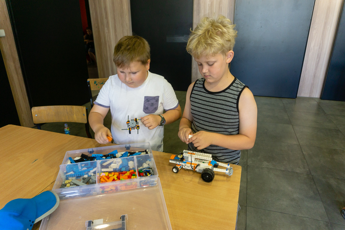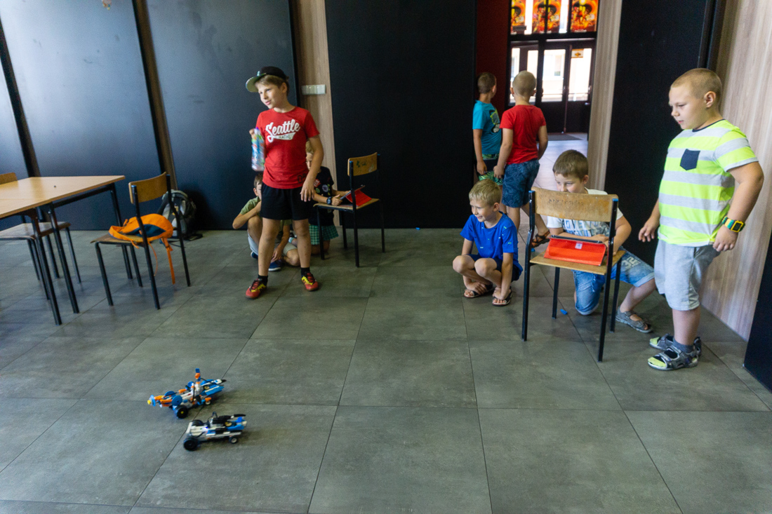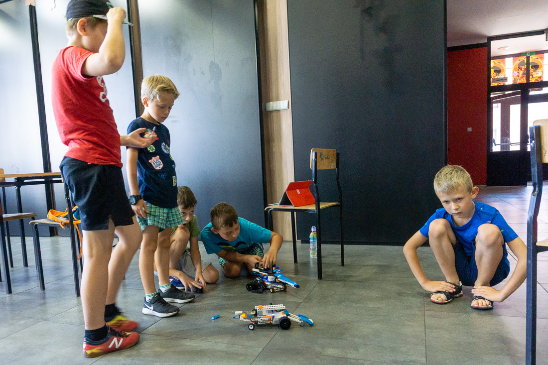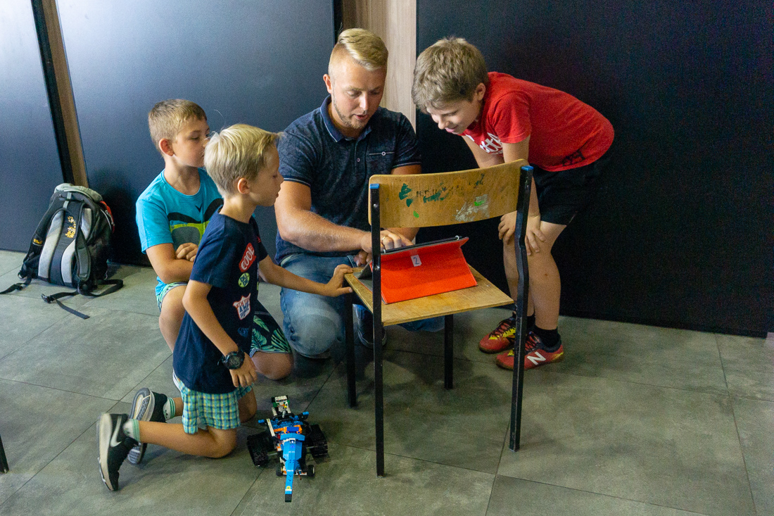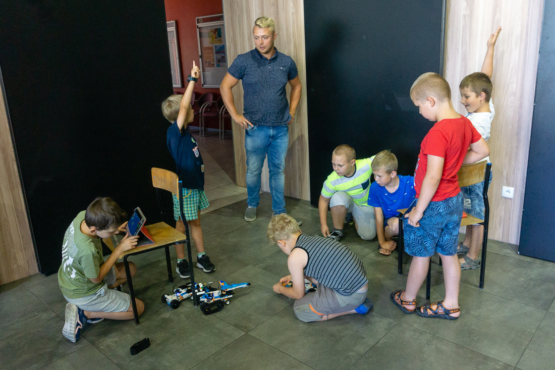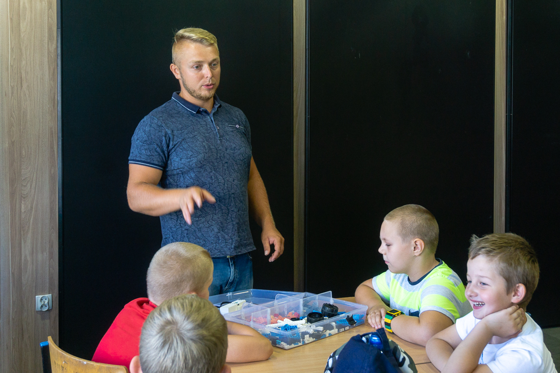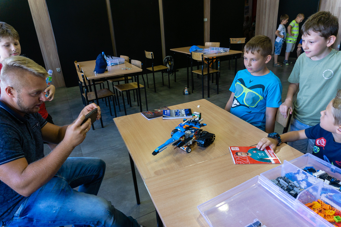 Sami dzielą się na grupy i zajmują miejsca przy stołach. – Dzisiaj będziemy budowali pojazdy – mówi Łukasz. – Będzie do zbudowania trochę z instrukcji. Następnie każdy zespół będzie budował na bazie instrukcji swój własny pojazd. Będzie można zbudować albo jakąś wyścigówkę, albo ciężarówkę, albo czołg, wóz bojowy, co tylko chcecie. Najpierw zbudujemy sobie to z instrukcji, później każdy zespół naradza się, co chce budować . I to będziemy budować.