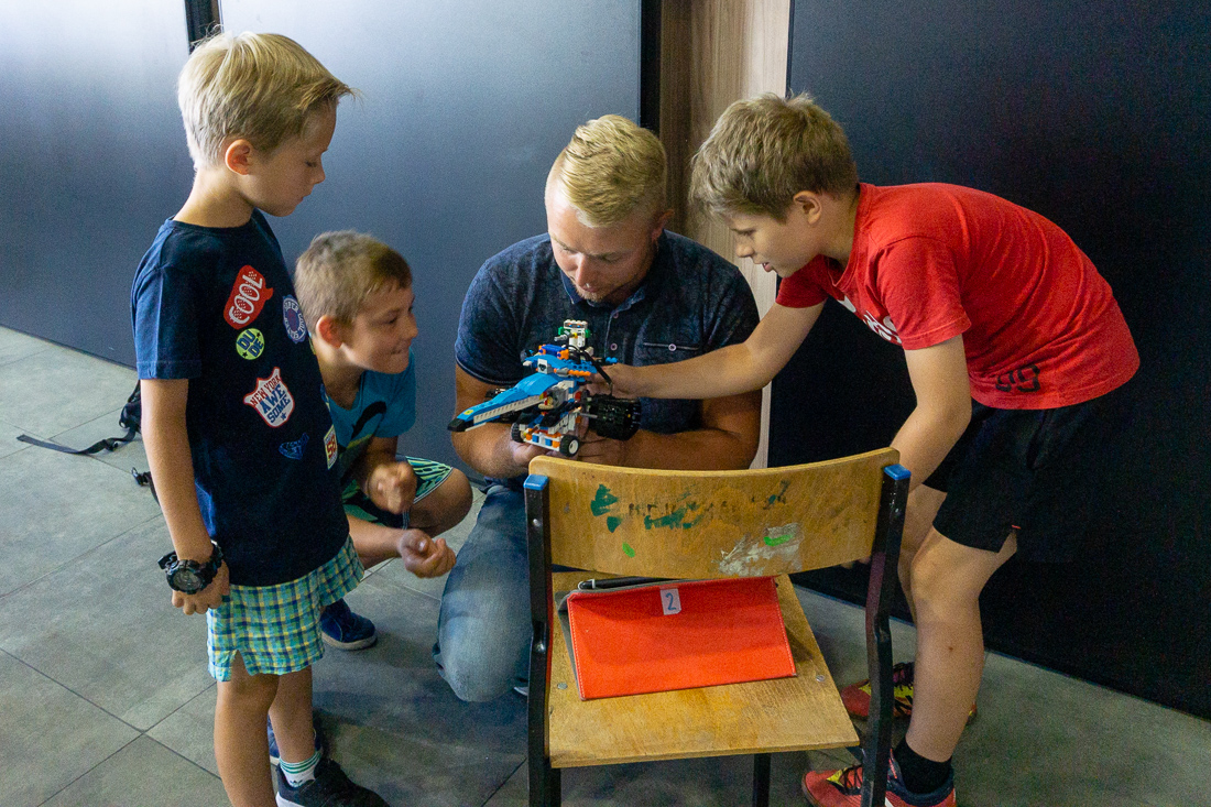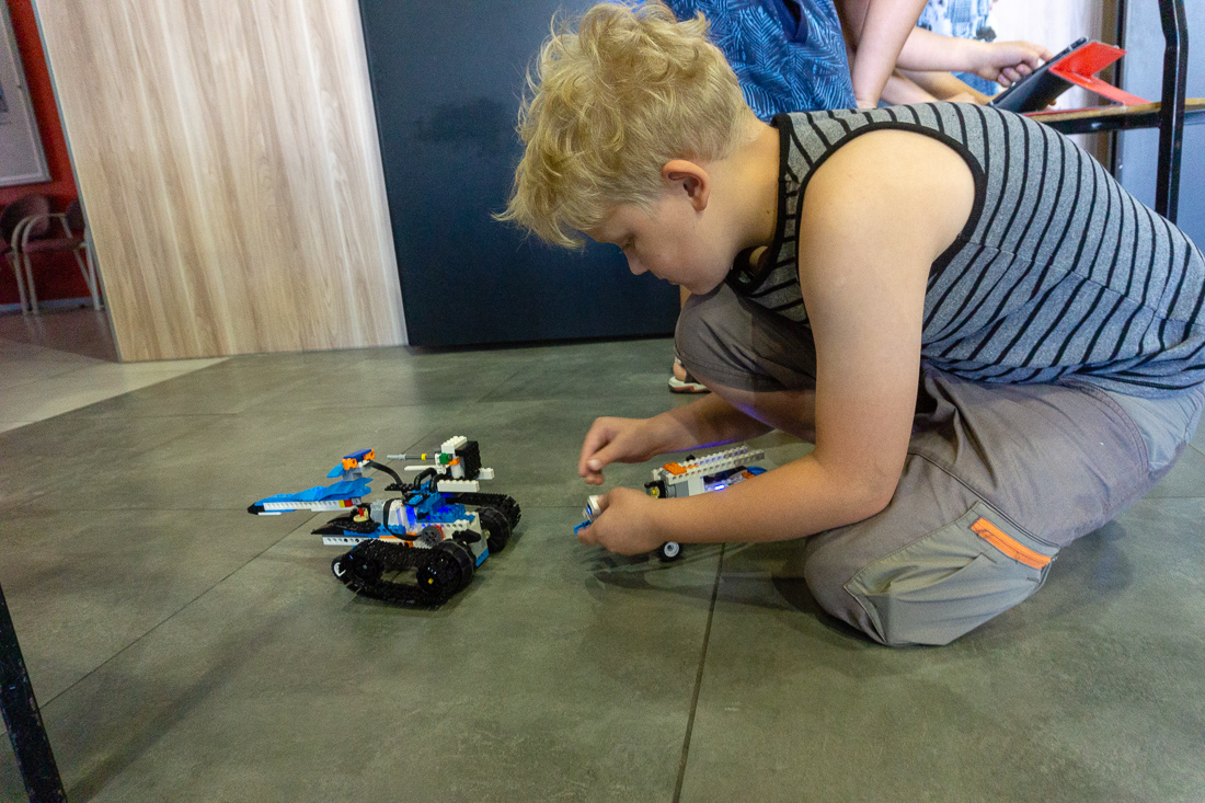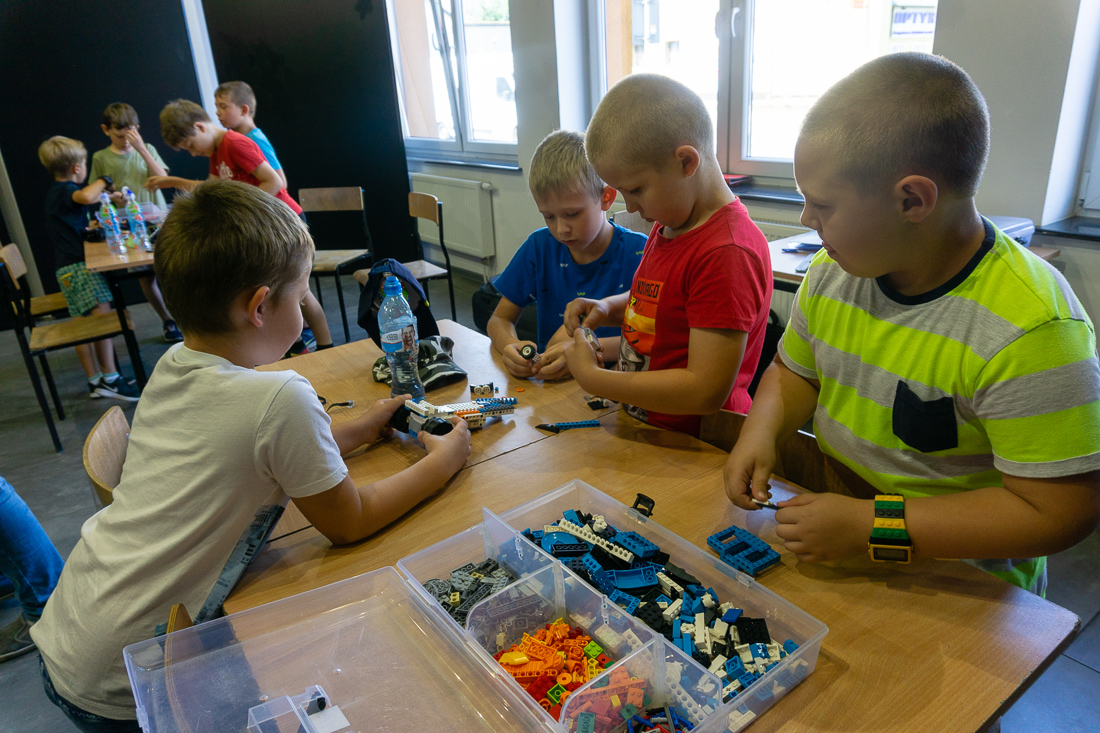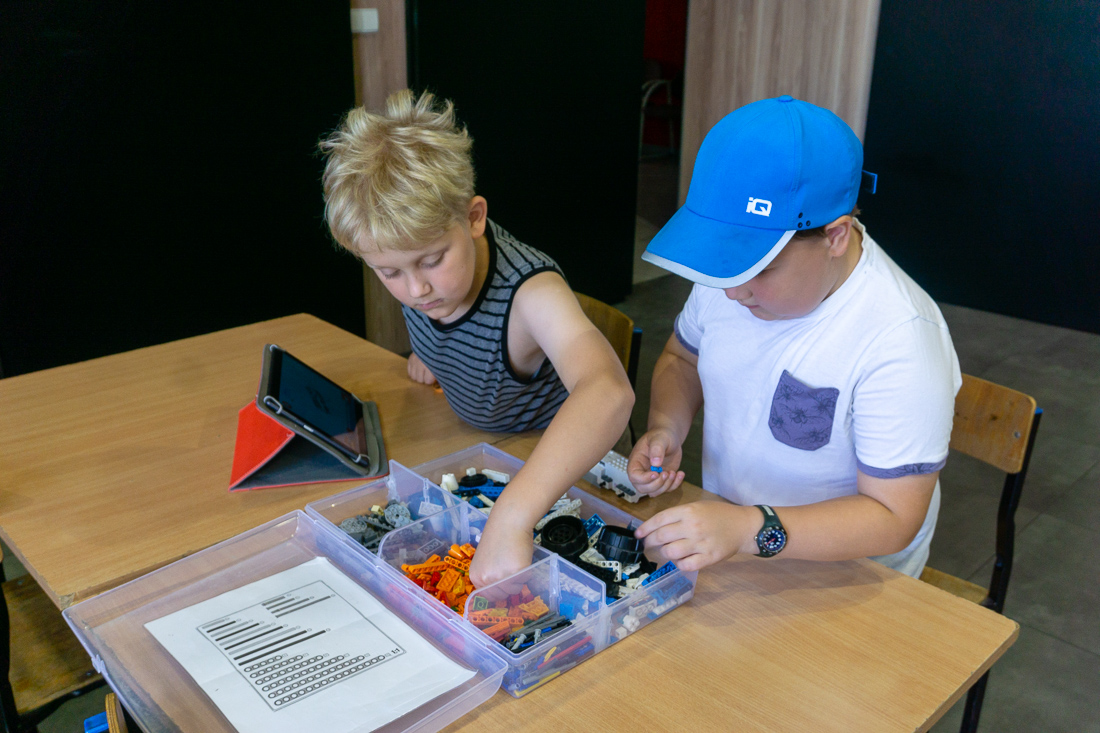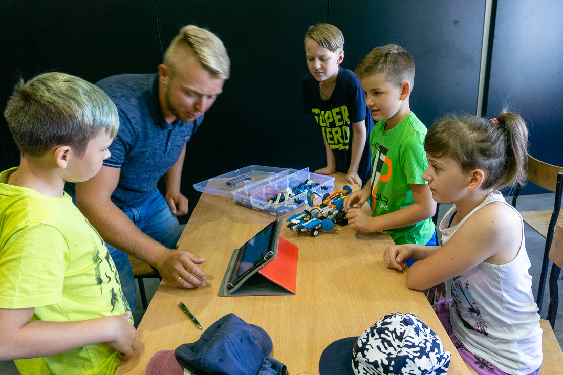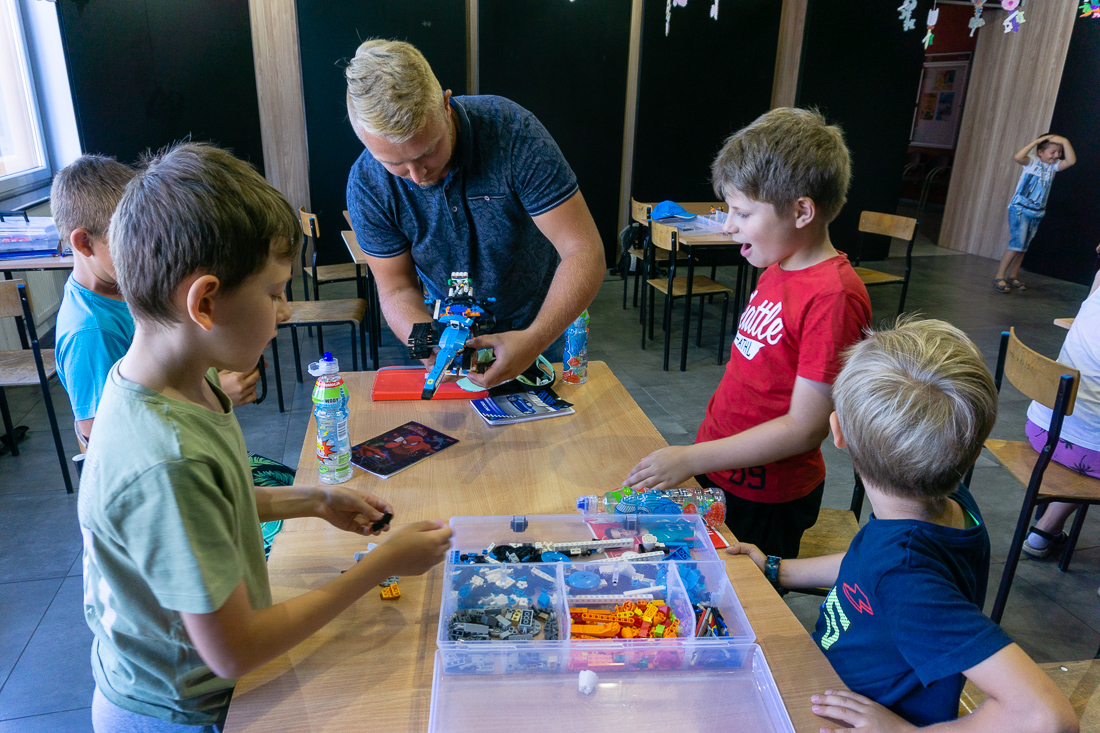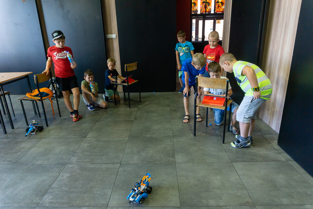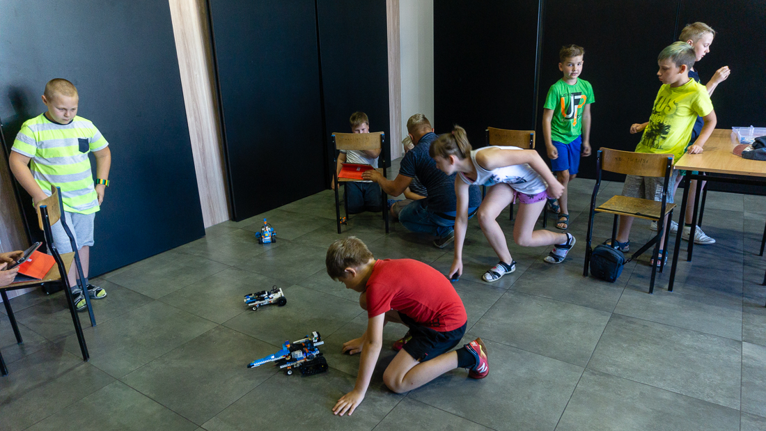 Sami dzielą się na grupy i zajmują miejsca przy stołach. – Dzisiaj będziemy budowali pojazdy – mówi Łukasz. – Będzie do zbudowania trochę z instrukcji. Następnie każdy zespół będzie budował na bazie instrukcji swój własny pojazd. Będzie można zbudować albo jakąś wyścigówkę, albo ciężarówkę, albo czołg, wóz bojowy, co tylko chcecie. Najpierw zbudujemy sobie to z instrukcji, później każdy zespół naradza się, co chce budować . I to będziemy budować.