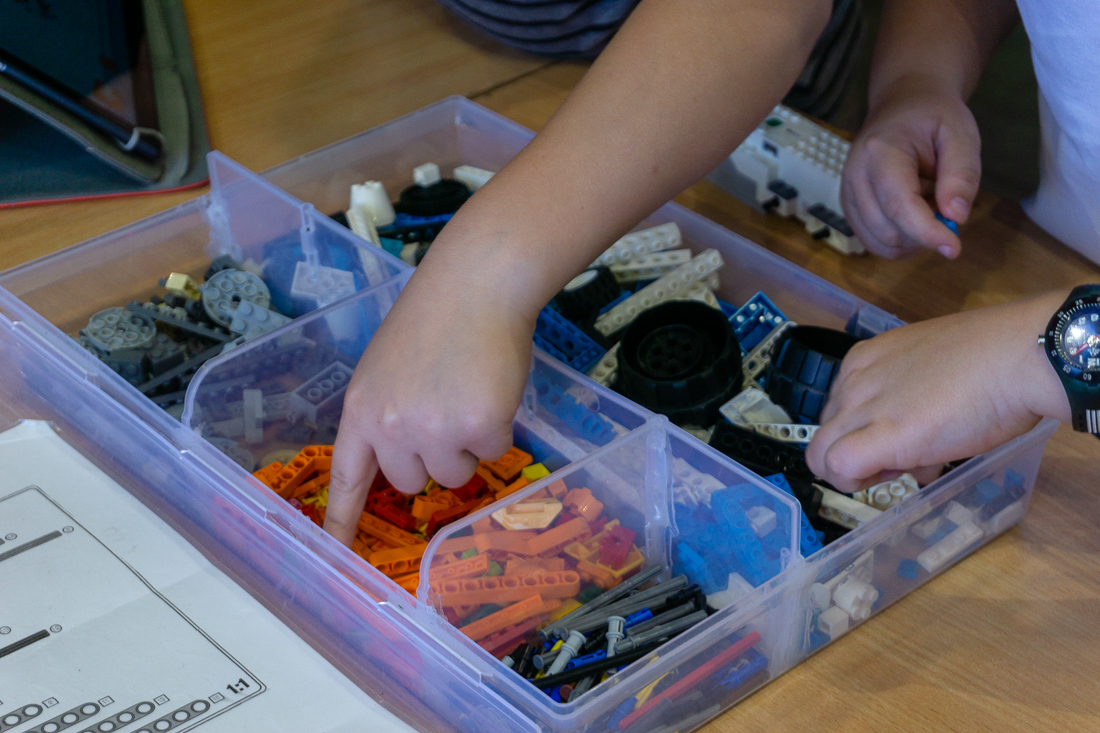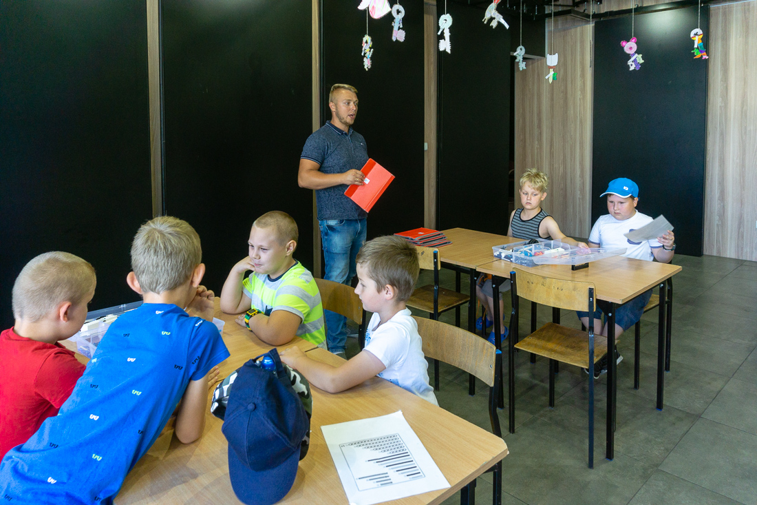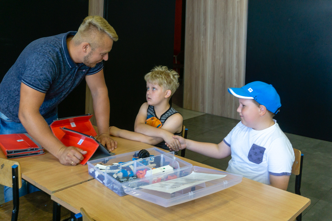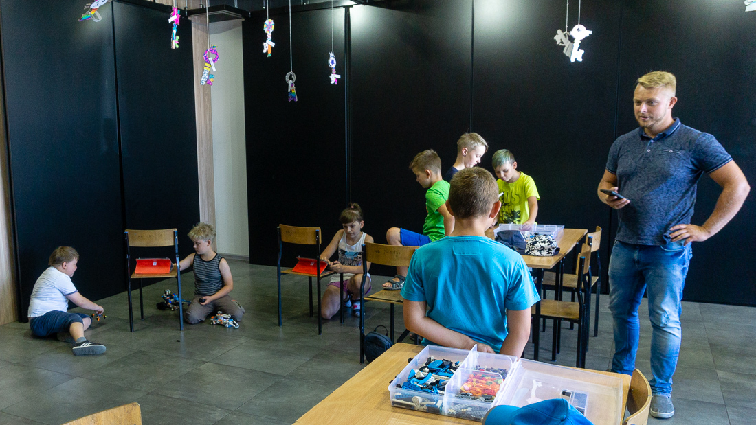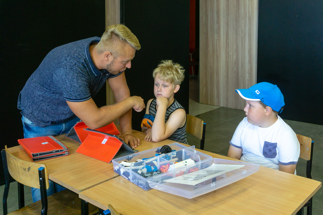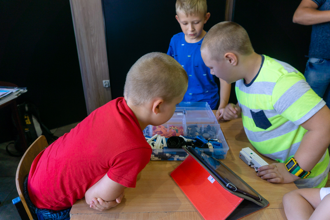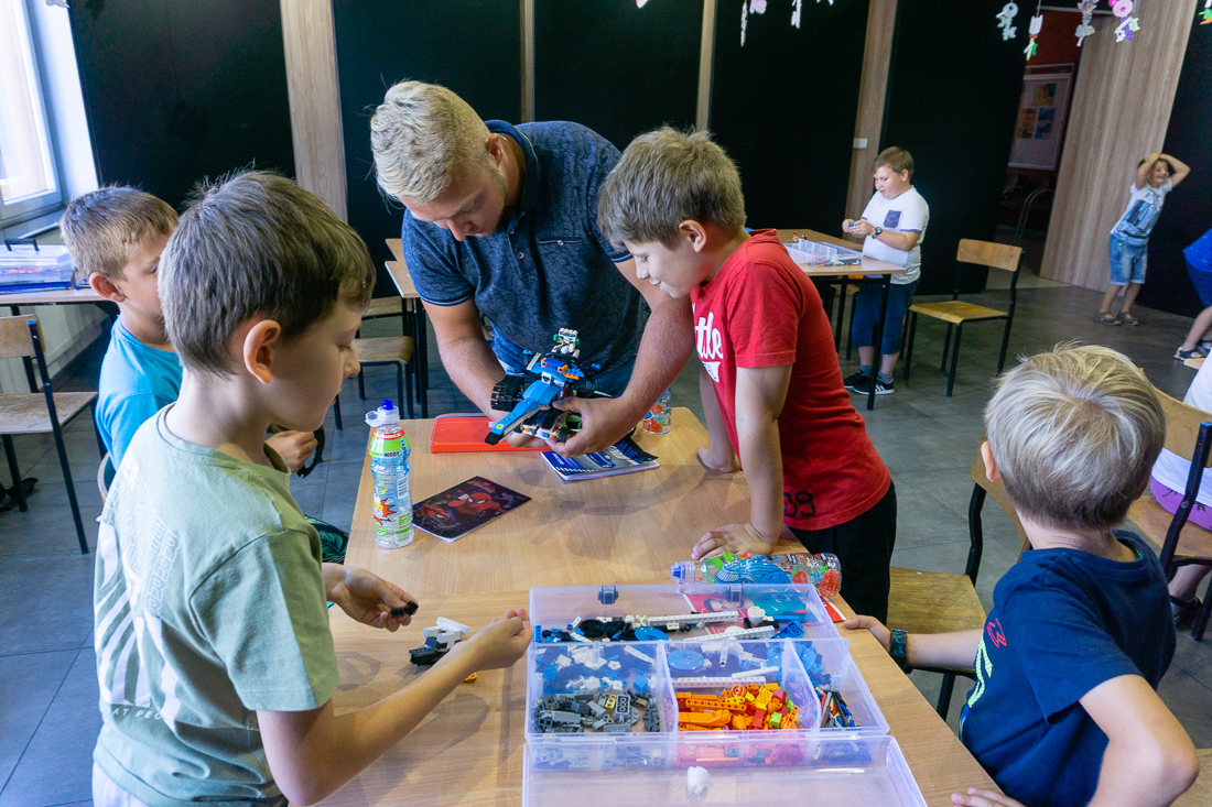 Sami dzielą się na grupy i zajmują miejsca przy stołach. – Dzisiaj będziemy budowali pojazdy – mówi Łukasz. – Będzie do zbudowania trochę z instrukcji. Następnie każdy zespół będzie budował na bazie instrukcji swój własny pojazd. Będzie można zbudować albo jakąś wyścigówkę, albo ciężarówkę, albo czołg, wóz bojowy, co tylko chcecie. Najpierw zbudujemy sobie to z instrukcji, później każdy zespół naradza się, co chce budować . I to będziemy budować.