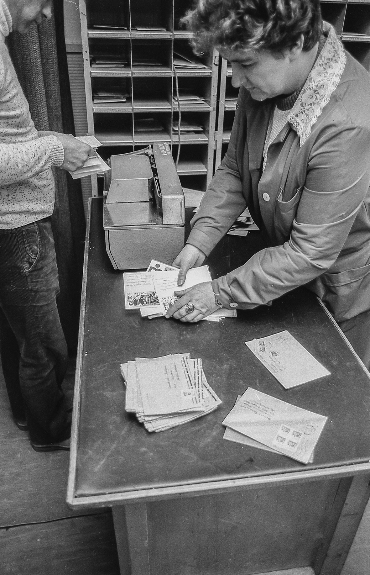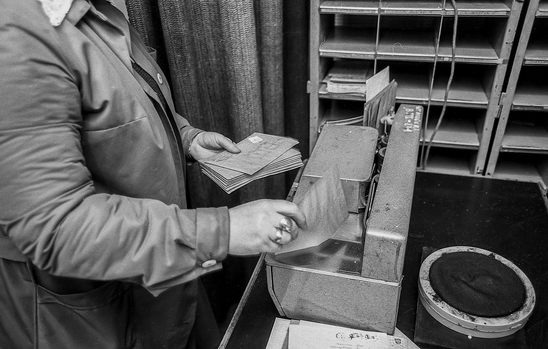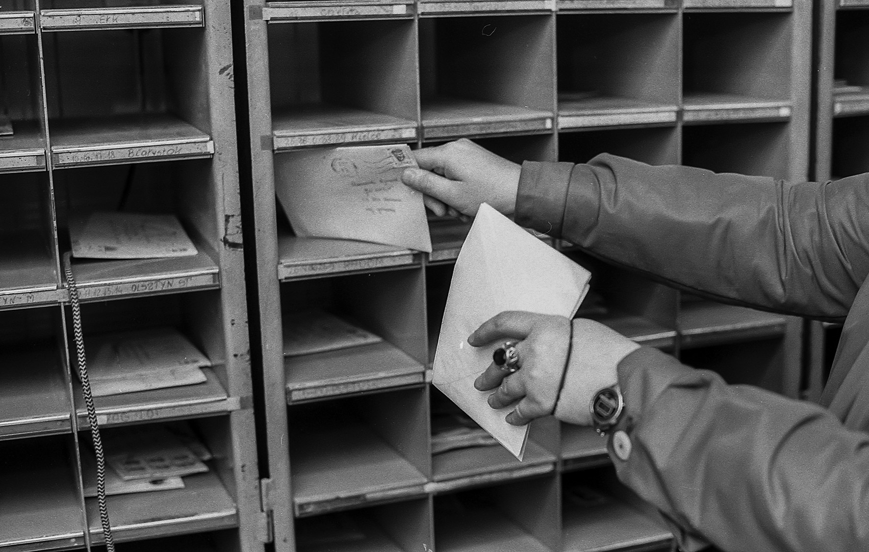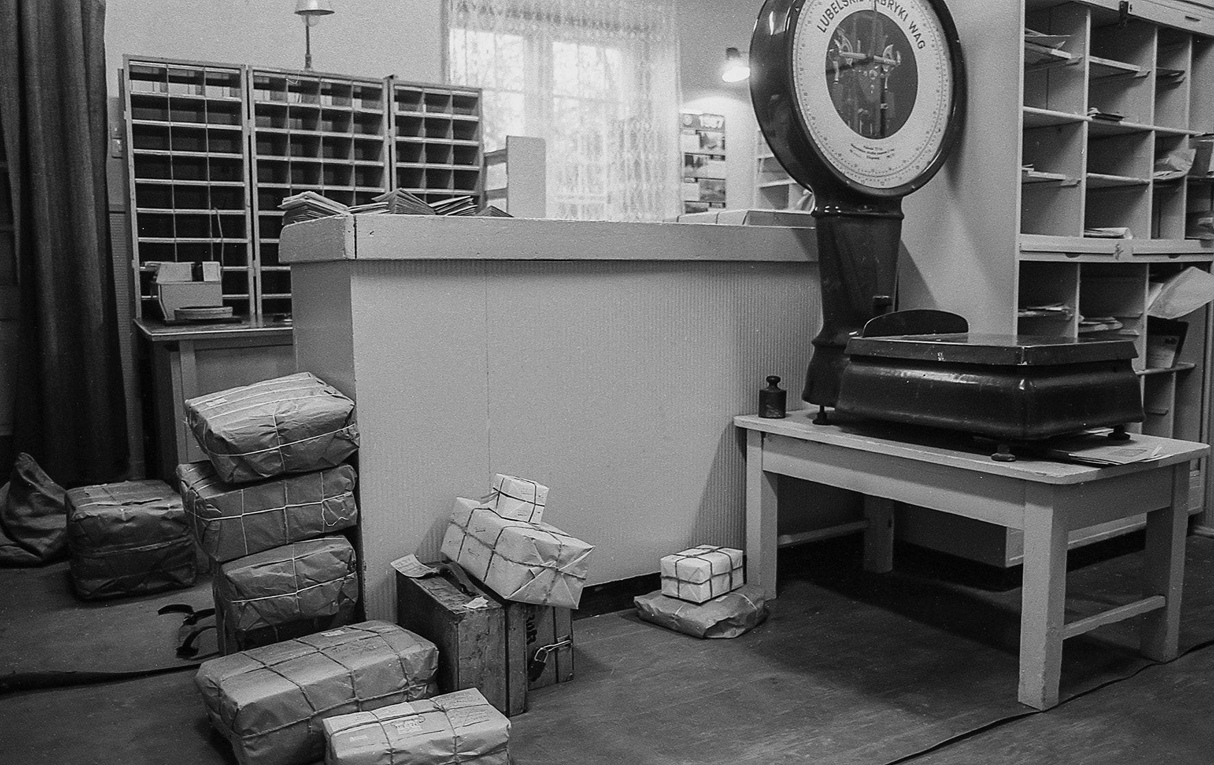 Stemplowanie i sortowanie listów, sprawdzanie prawidłowości nalepionych znaczków, czytelności adresu, prawidłowości pocztowego kodu, odbywała się ręcznie. W taki właśnie czas, 32 lata temu, w końcu listopada 1986 roku, odwiedziłem z aparatem fotograficznym urząd pocztowy w Makowie Mazowieckim. Uważny czytelnik zauważy, jak wiele się od tamtych czasów zmieniło. Wszechobecne popielniczki (w biurach nie było zakazów palenia), ręczne stemple i waga, teleks (urządzenie praktycznie dziś nieznane – kto powie jak działało i do czego służyło?).