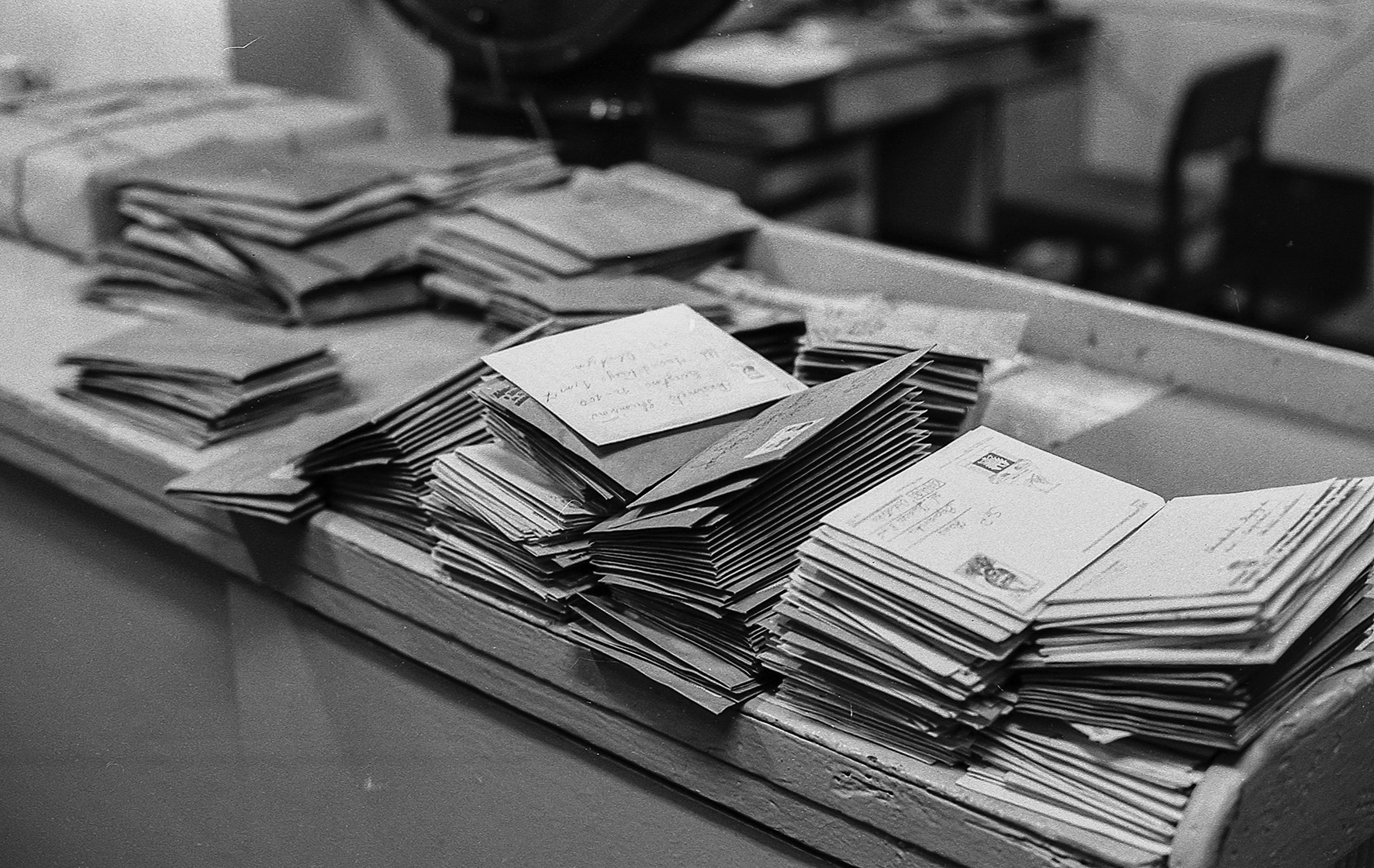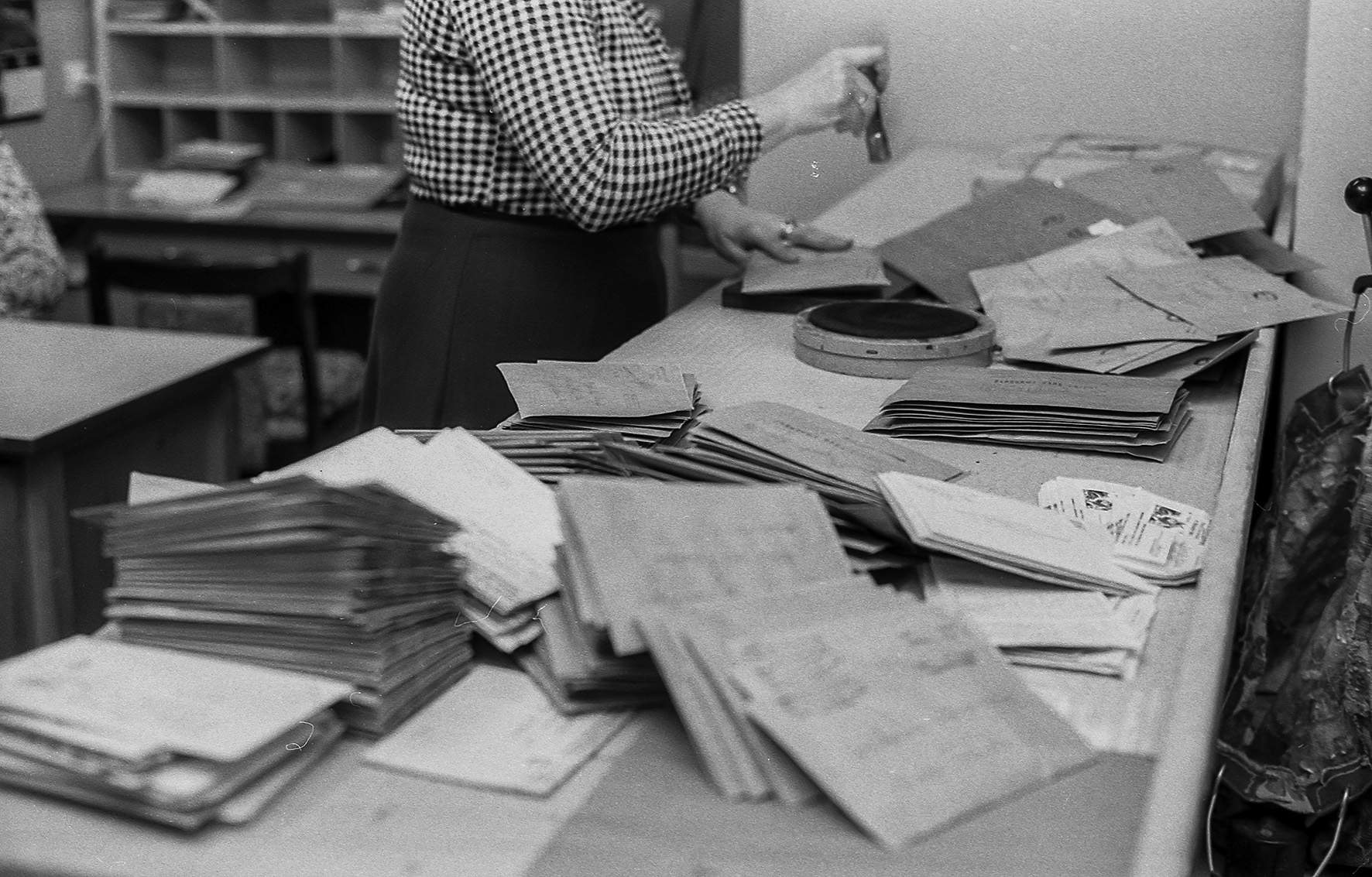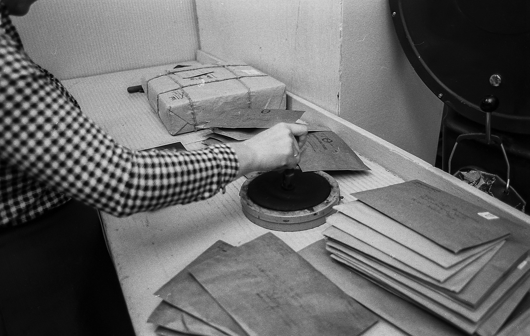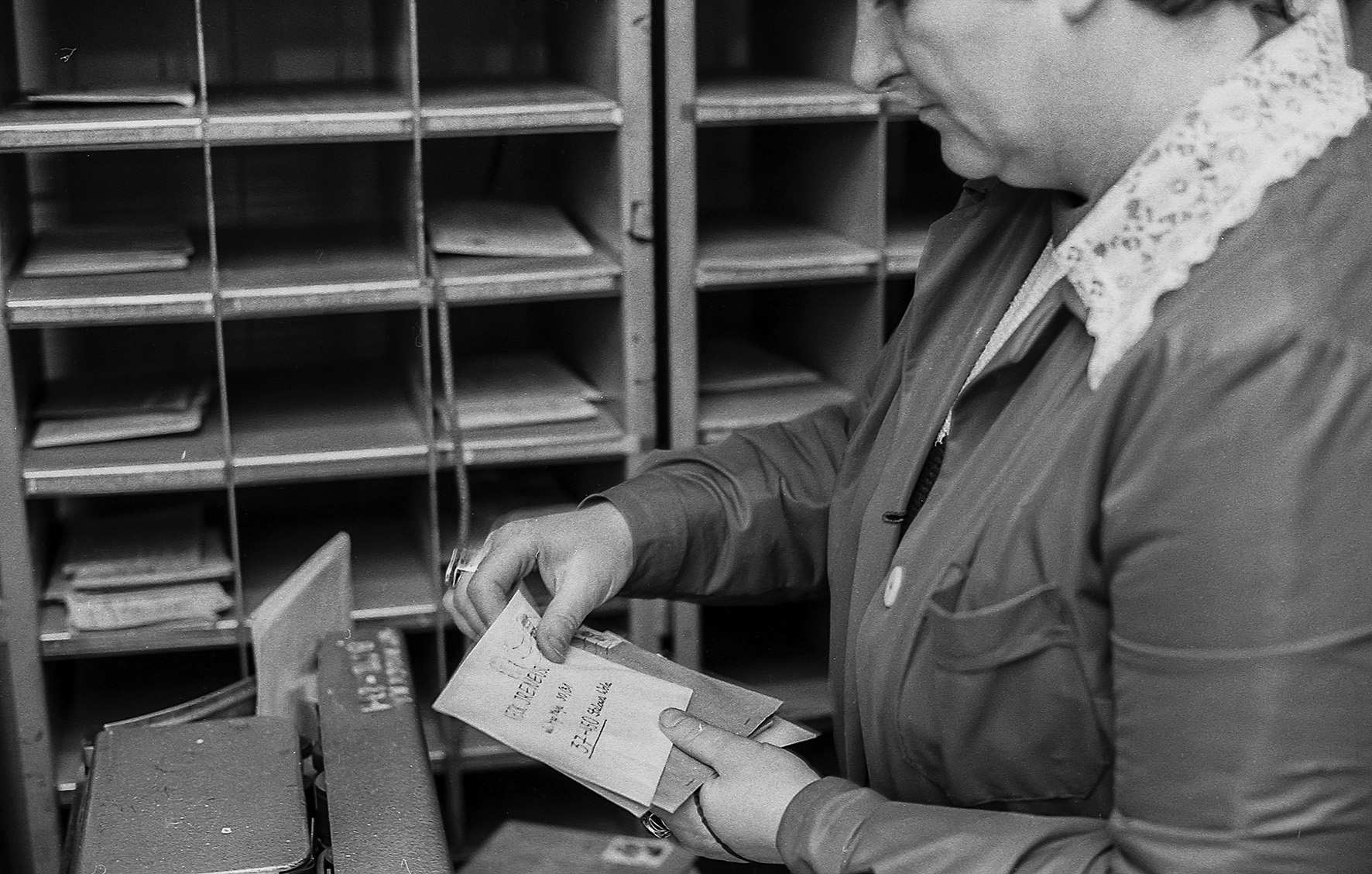 Stemplowanie i sortowanie listów, sprawdzanie prawidłowości nalepionych znaczków, czytelności adresu, prawidłowości pocztowego kodu, odbywała się ręcznie. W taki właśnie czas, 32 lata temu, w końcu listopada 1986 roku, odwiedziłem z aparatem fotograficznym urząd pocztowy w Makowie Mazowieckim. Uważny czytelnik zauważy, jak wiele się od tamtych czasów zmieniło. Wszechobecne popielniczki (w biurach nie było zakazów palenia), ręczne stemple i waga, teleks (urządzenie praktycznie dziś nieznane – kto powie jak działało i do czego służyło?).