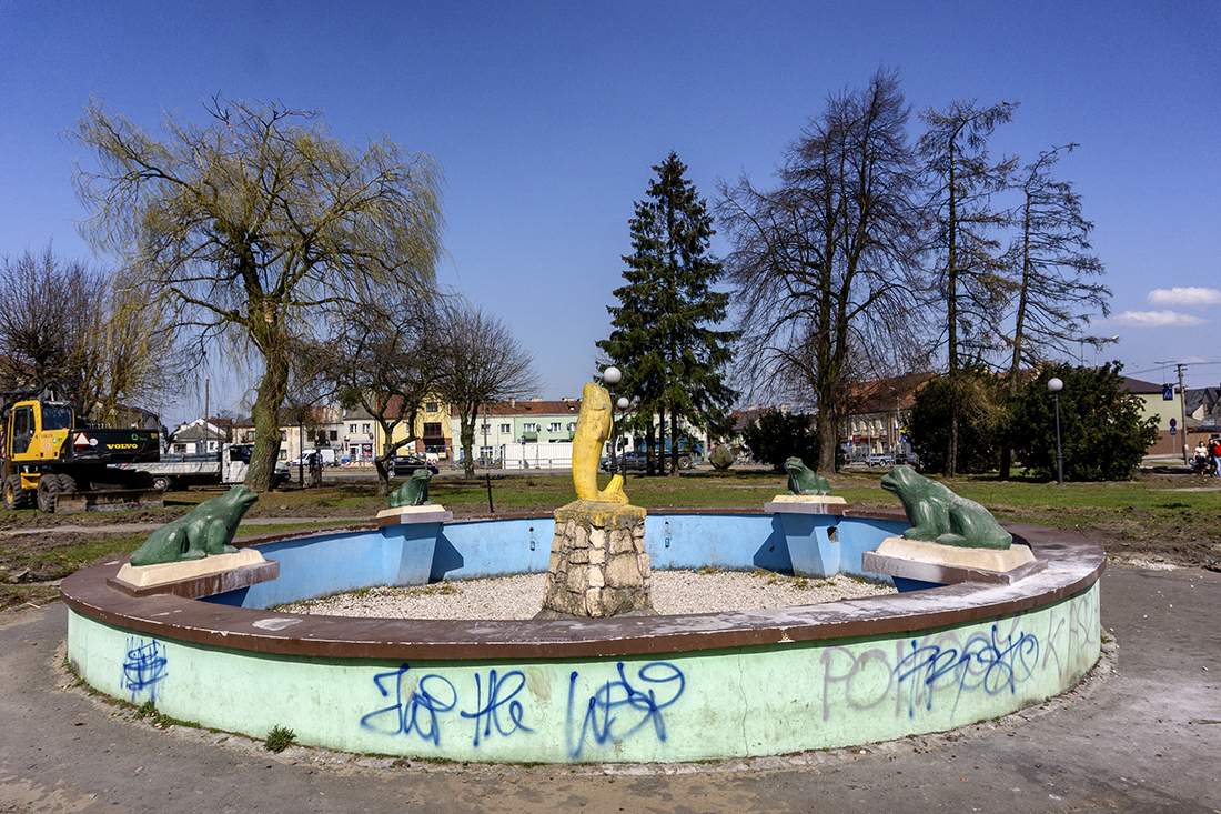 Przedwczoraj cieszyliśmy się, że żaby z fontanny znalazły swoje miejsce przy zalewie. Siedzą obok nowych ławek, wszystkie cztery. Ale gdzie dał nura ich towarzysz – delfin?