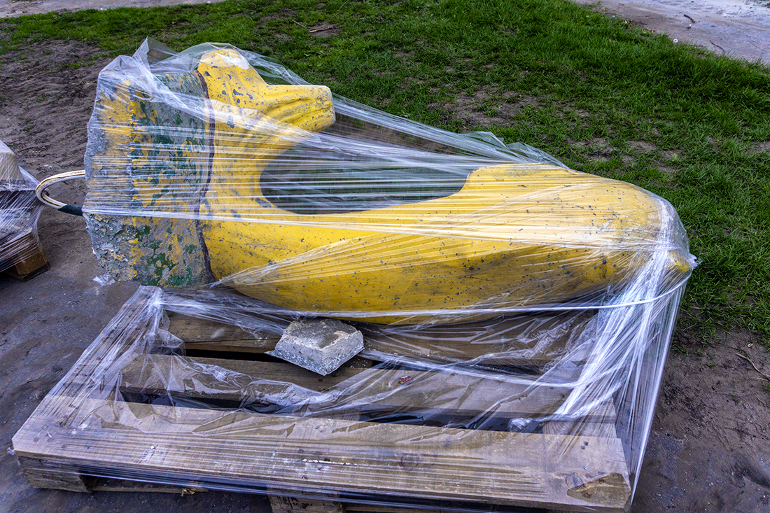 Na zdjęciach: delfin na cokole oraz delfin zapakowany w folię. Kwiecień 2018 roku.
