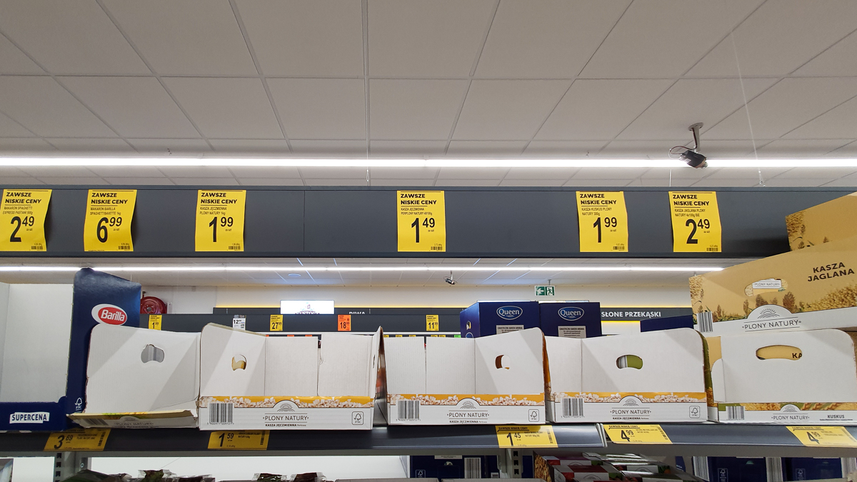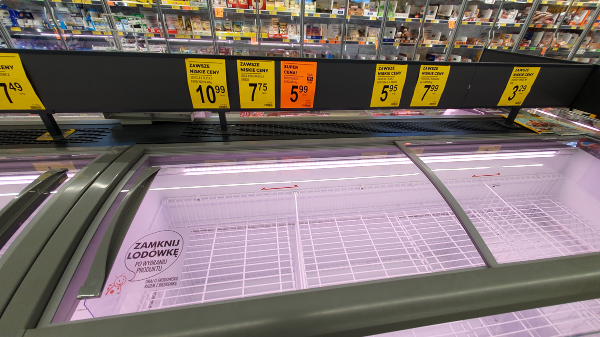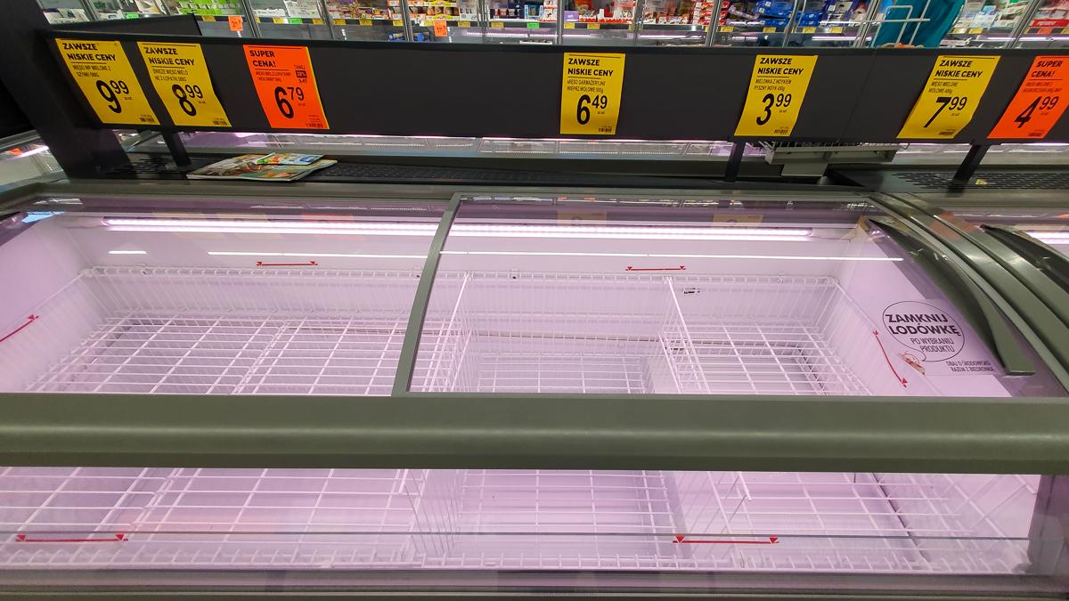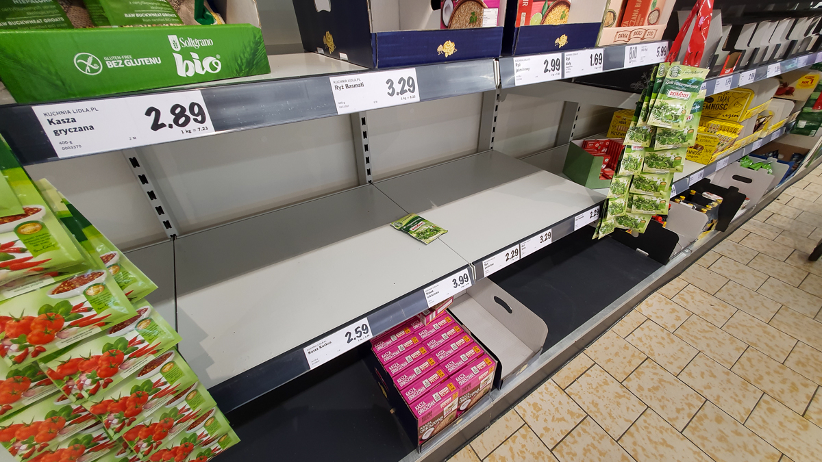 W Lidlu z kasz dostępna była tylko kasza bulgar. Z makaronów można było kupić włoskie spaghetti oraz lasagne. Nie było też przecieru pomidorowego. Niewiele było mąki. Prawie całkowicie puste były lodówki z mięsem. Zabrakło papieru toaletowego i papierowych ręczników.