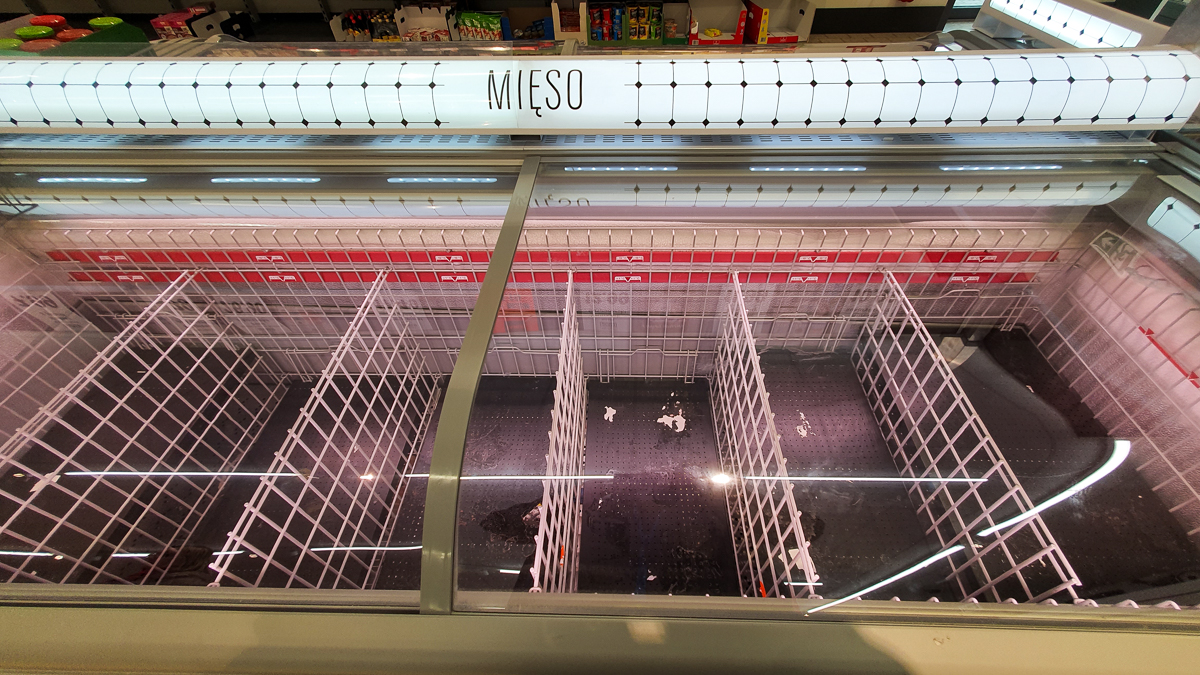 W nowej Biedronce przy Przasnyskiej sytuacja wyglądała nieco lepiej. Były papierowe ręczniki i ostatnie zgrzewki papieru toaletowego. Można było też kupić przecier pomidorowy. Lodówki z mięsem były jednak prawie całkowicie opróżnione.
