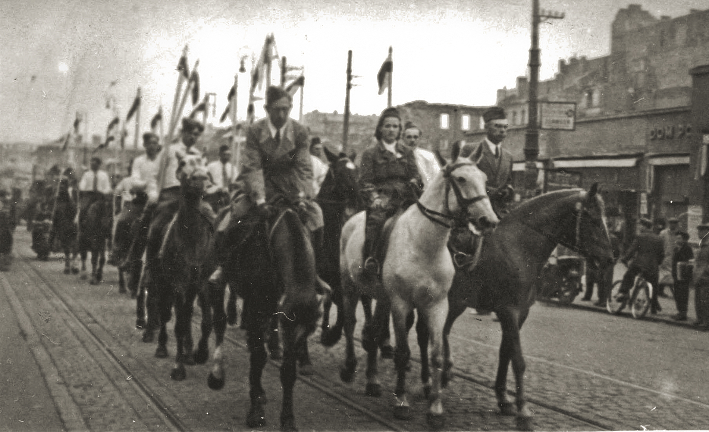 Pierwszy maja na ulicach zrujnowanej Warszawy, Jerzy Rostkowski pierwszy z lewej. Lata 40. XX w.