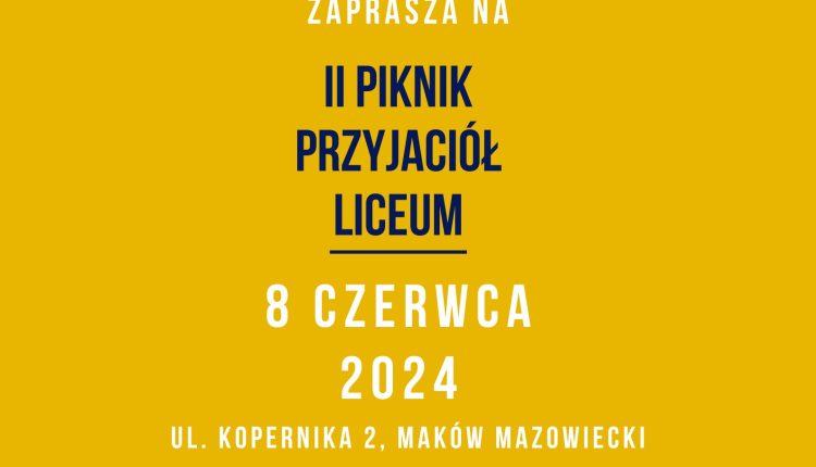Zarząd Stowarzyszenia Pomocy Liceum im. Marii Curie Skłodowskiej w Makowie Mazowieckim ma zaszczyt zaprosić Państwa na II Piknik Przyjaciół Liceum, który odbędzie się 8 czerwca 2024 roku w patio, na terenie naszej szkoły.
