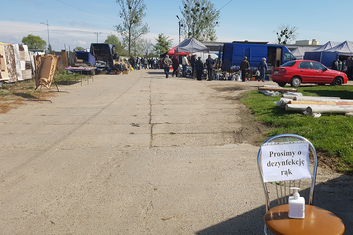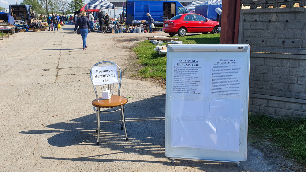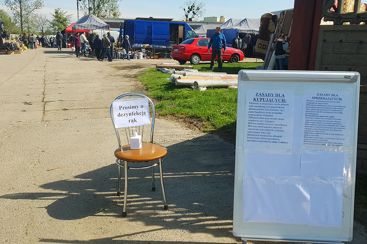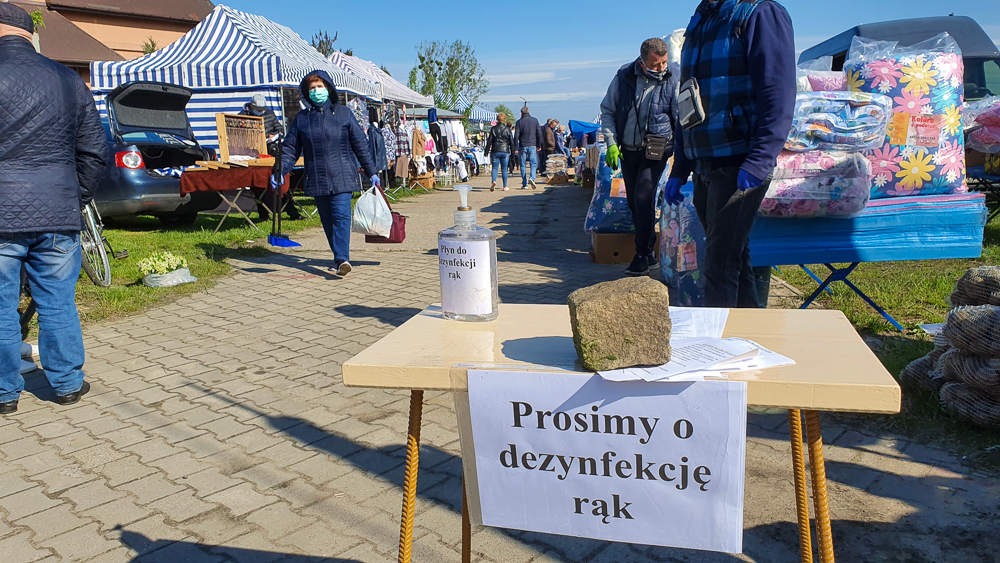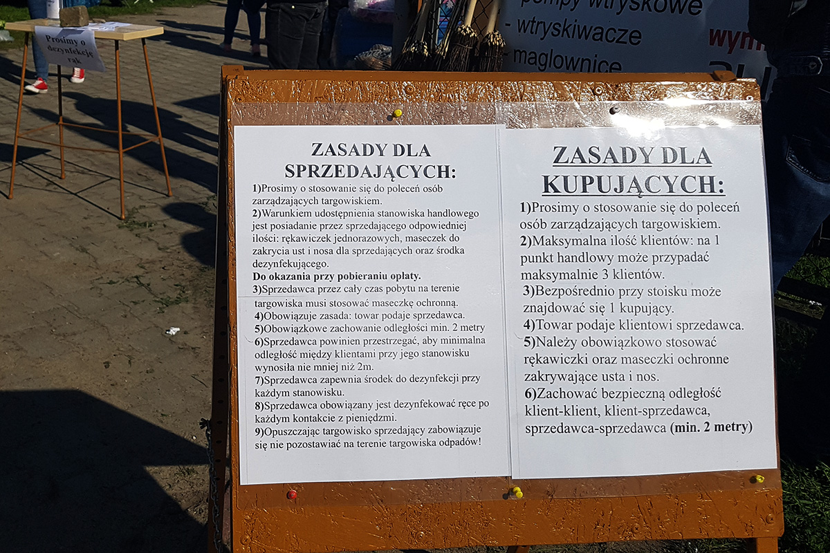 Towar podawać mógł tylko sprzedawca, a minimalna odległość pomiędzy klientami przy stoisku musiała wynosić 2 metry. Po każdym kontakcie z pieniędzmi sprzedawca zobowiązany był zdezynfekować ręce.
