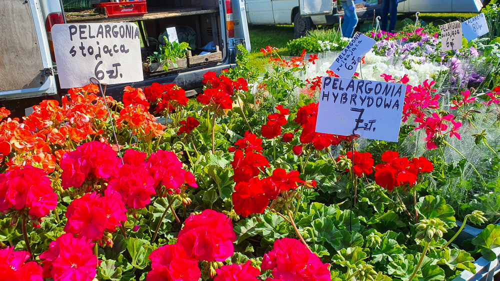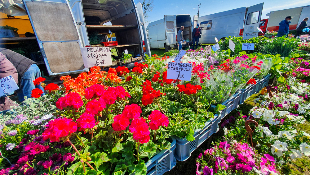 Najciekawsza była część sezonowa – sadzonki kwiatów i warzyw. Było wiele pięknych okazów pelargonii, werbeny, goździków. Także sadzonki pomidorów były w dużym wyborze: niskich, wysokich, pod folię i do gruntu. Sprzedawcy zachęcali obawiających się przymrozków klientów optymistycznymi prognozami, wedle których już za kilka dni czeka nas pogoda niemal upalna. Wtorkowa poranna śnieżyca zmroziła jednak nabywców i ci w większości woleli wstrzymać się z zakupami do następnego jarmarku.