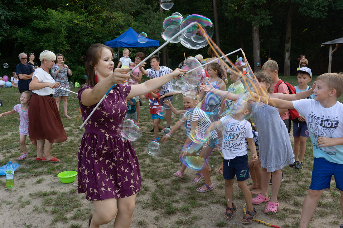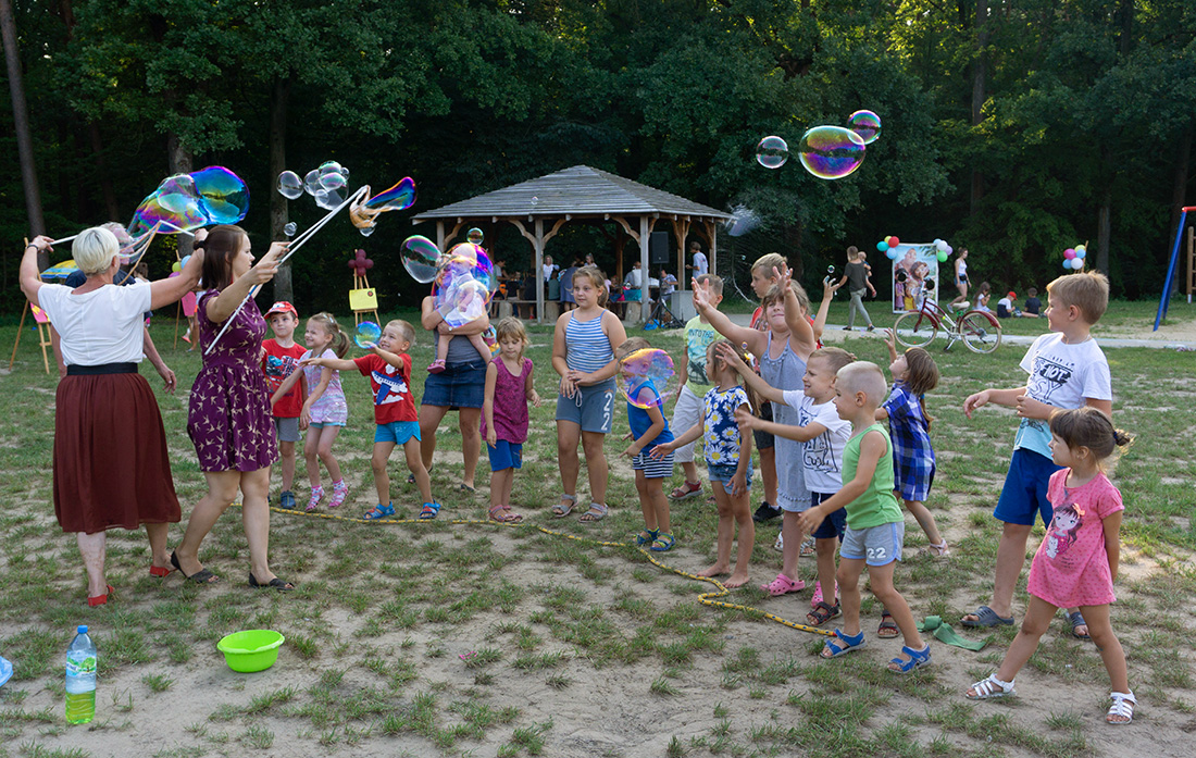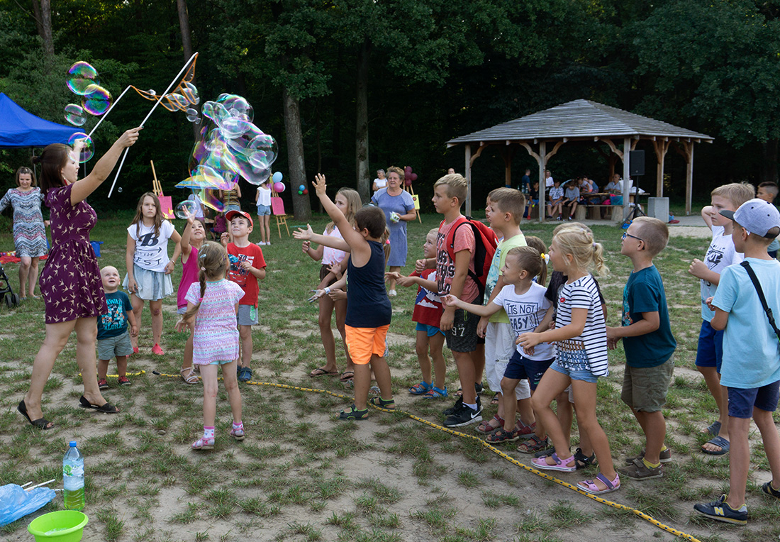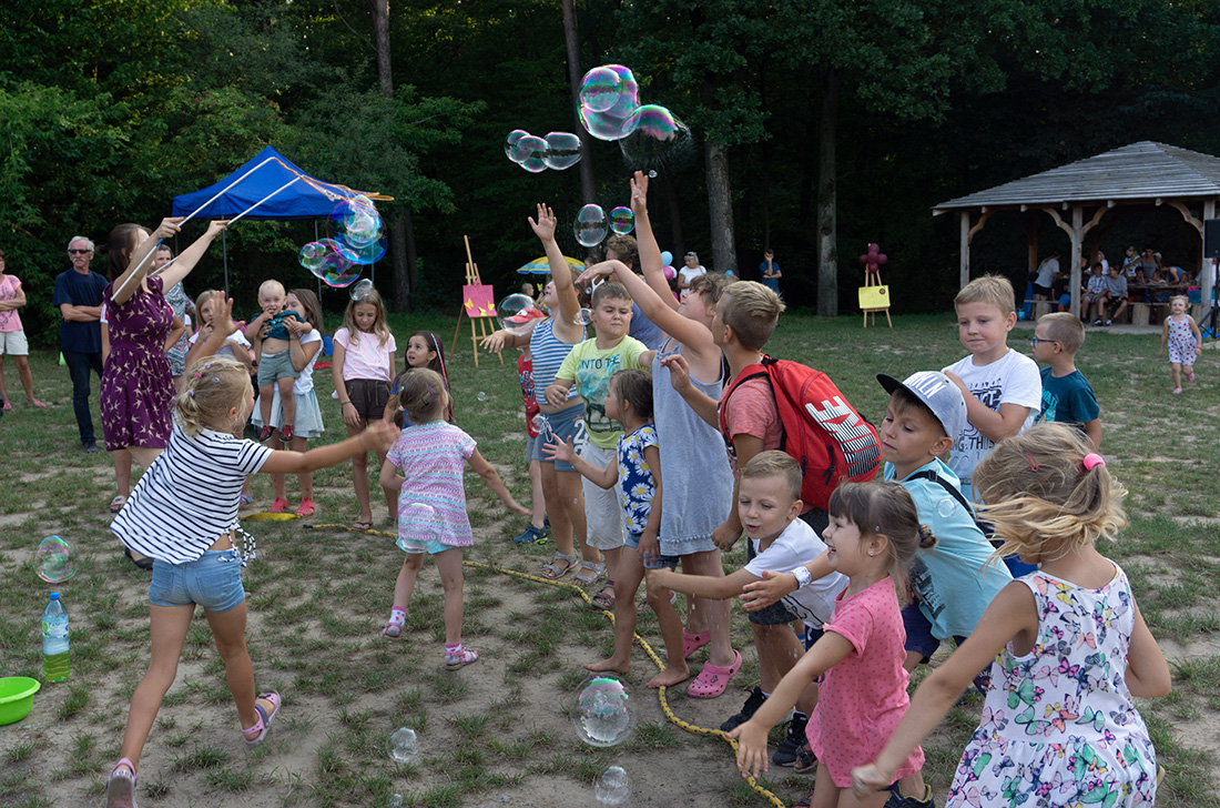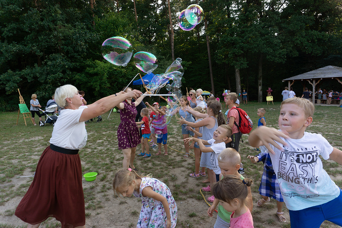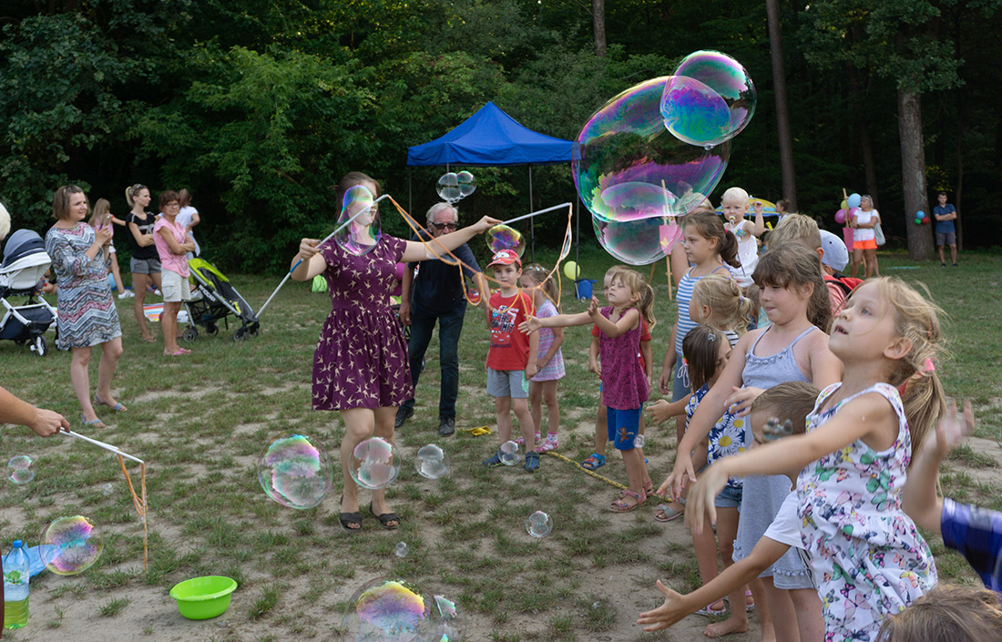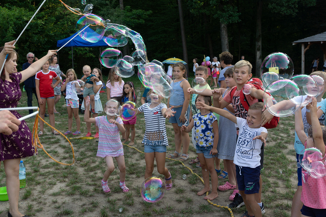 Na – prawie – zakończenie odbyła się konkurencja chwytania mydlanych baniek, wypuszczanych przez Kasię i Monikę Wojnarowską. Uczestnicy tej konkurencji po zbiciu kolorowej bańki udawali się na kiełbaski z grilla. Wystarczyło dla wszystkich dzieci i opiekunów.