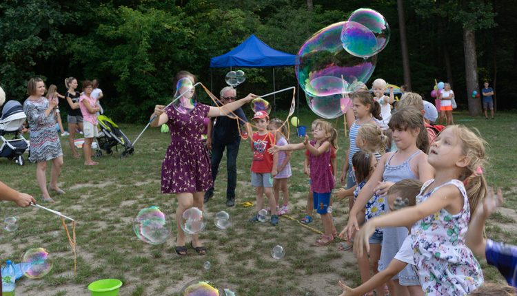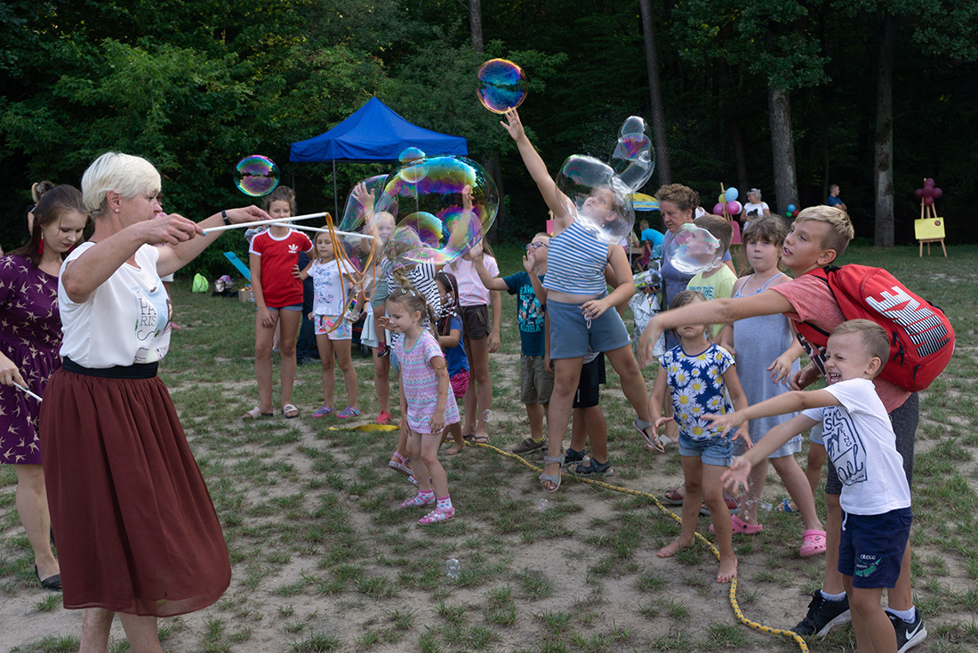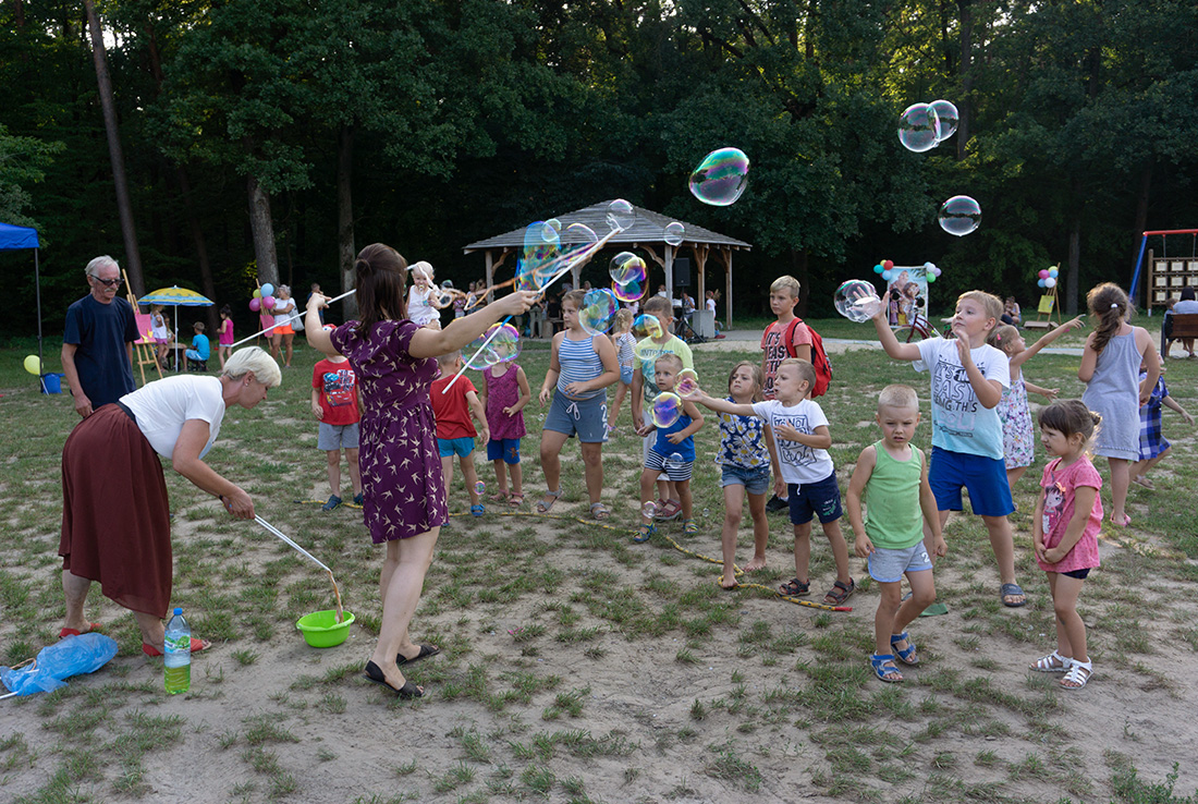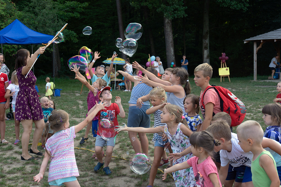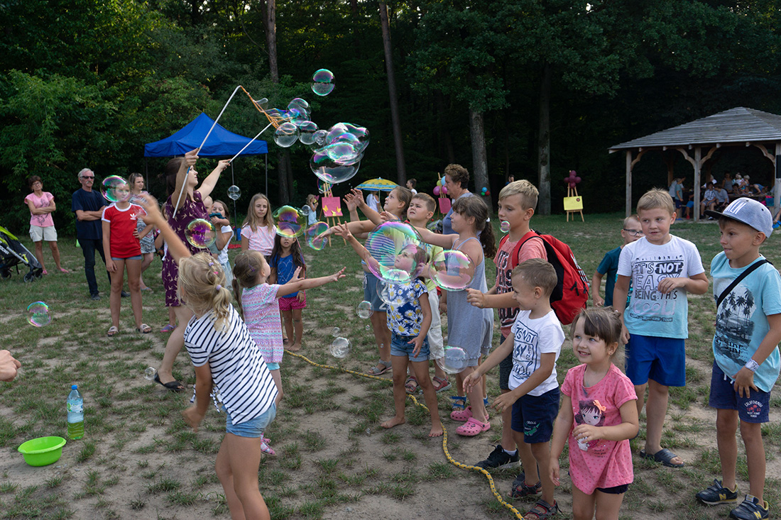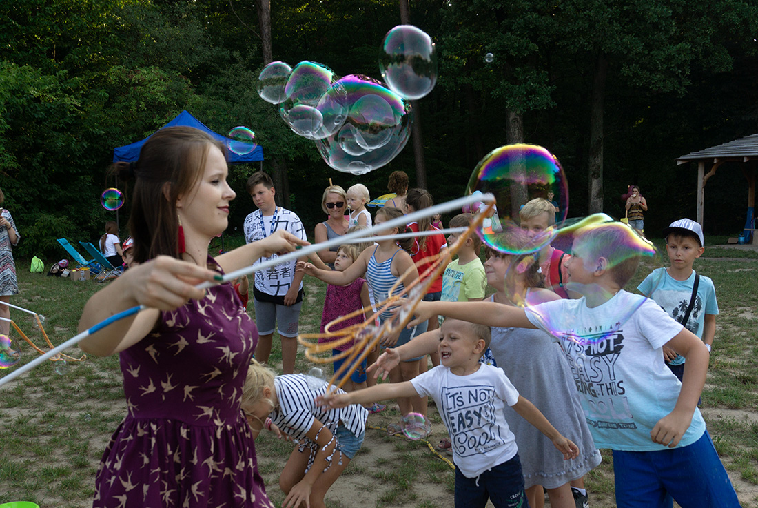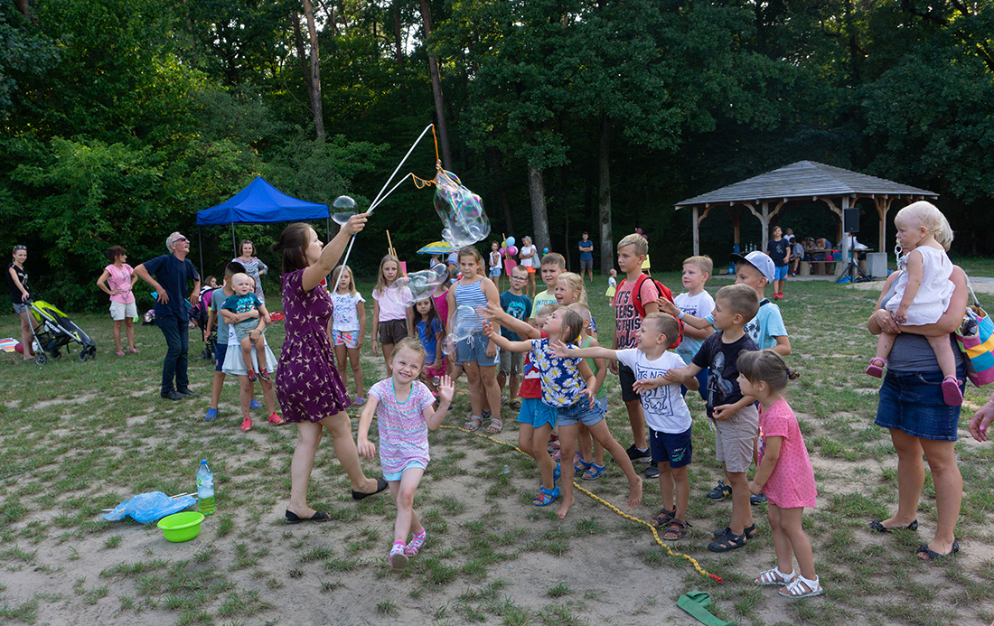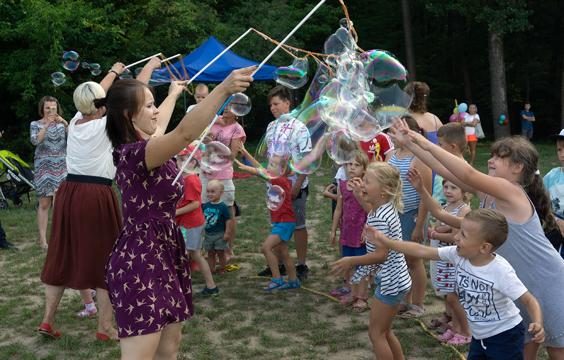 Na – prawie – zakończenie odbyła się konkurencja chwytania mydlanych baniek, wypuszczanych przez Kasię i Monikę Wojnarowską. Uczestnicy tej konkurencji po zbiciu kolorowej bańki udawali się na kiełbaski z grilla. Wystarczyło dla wszystkich dzieci i opiekunów.