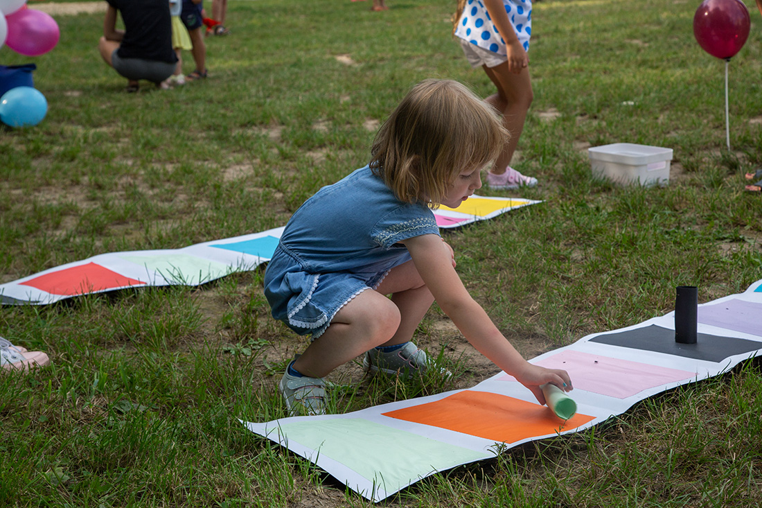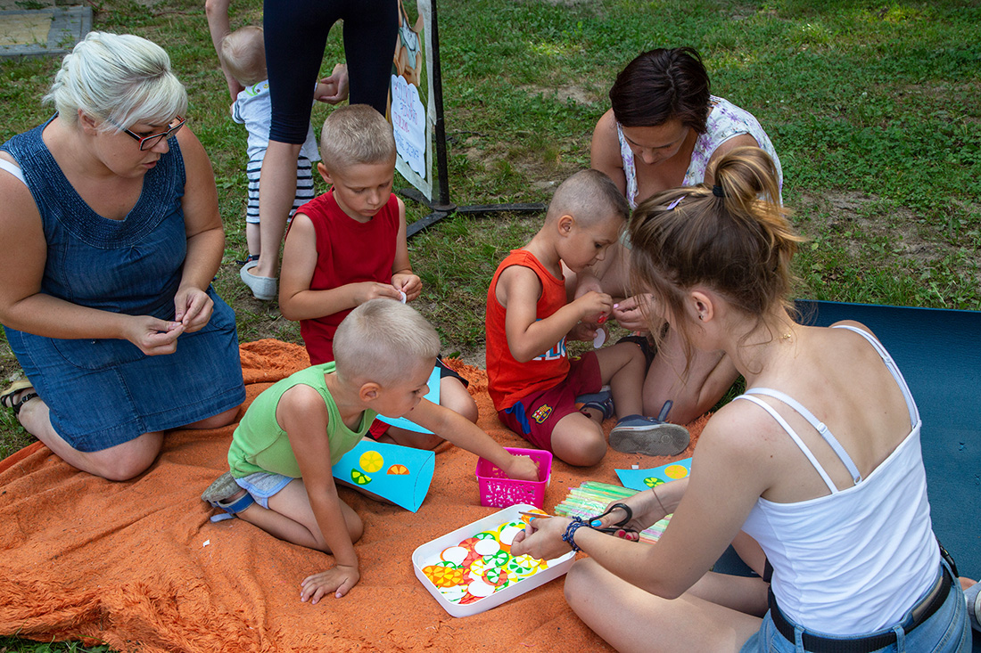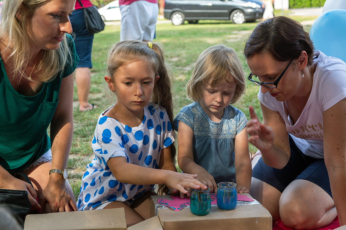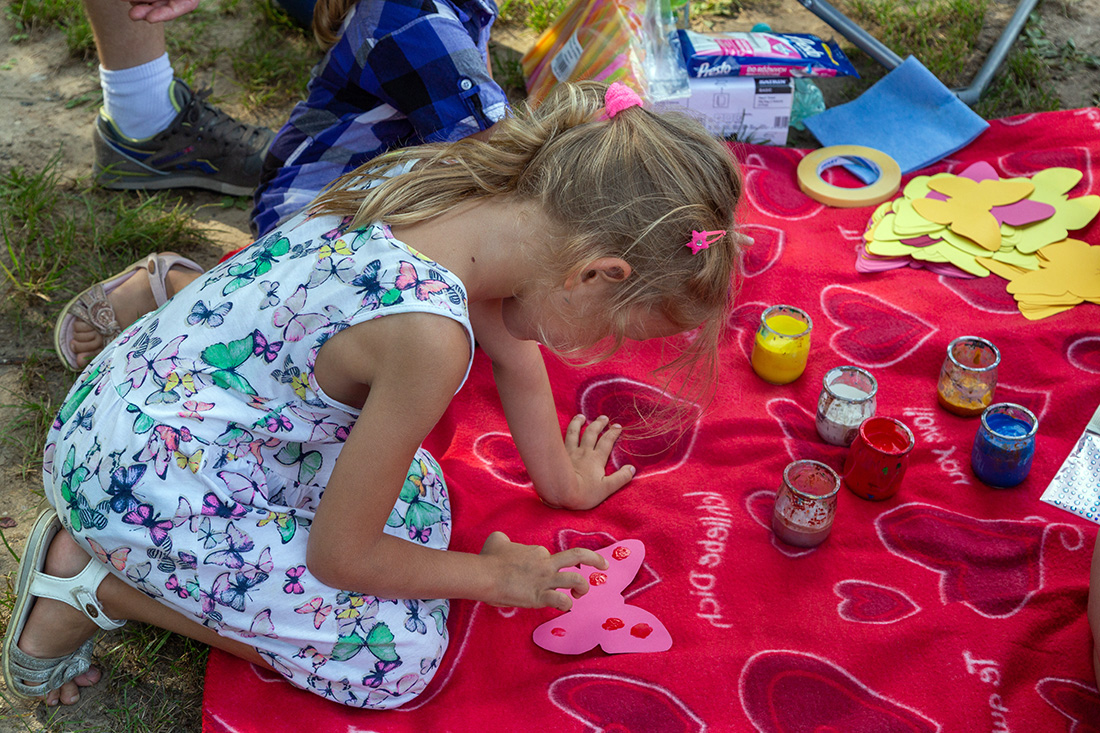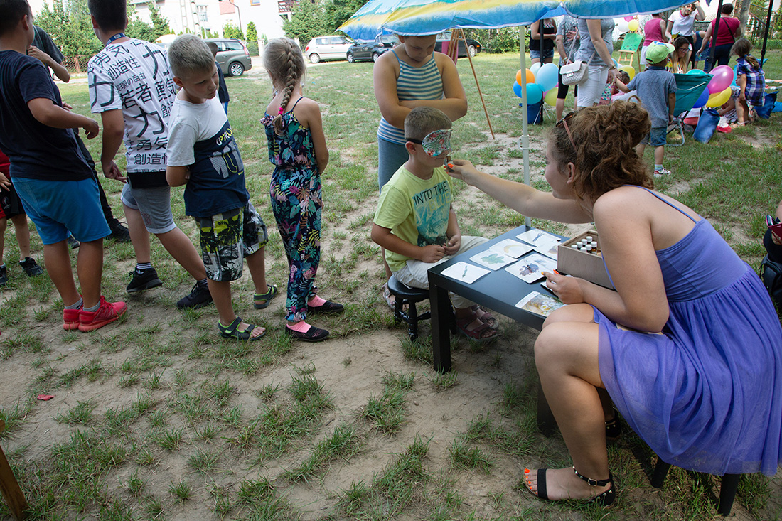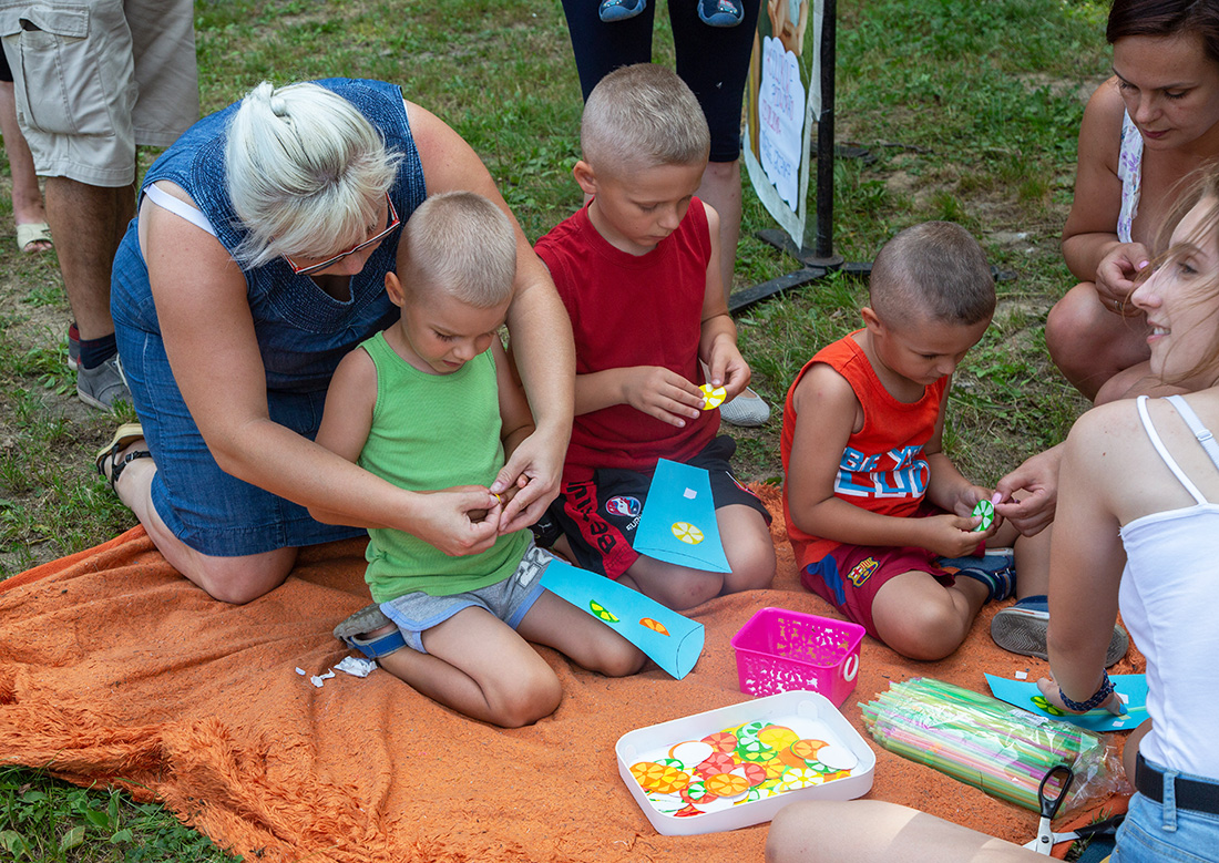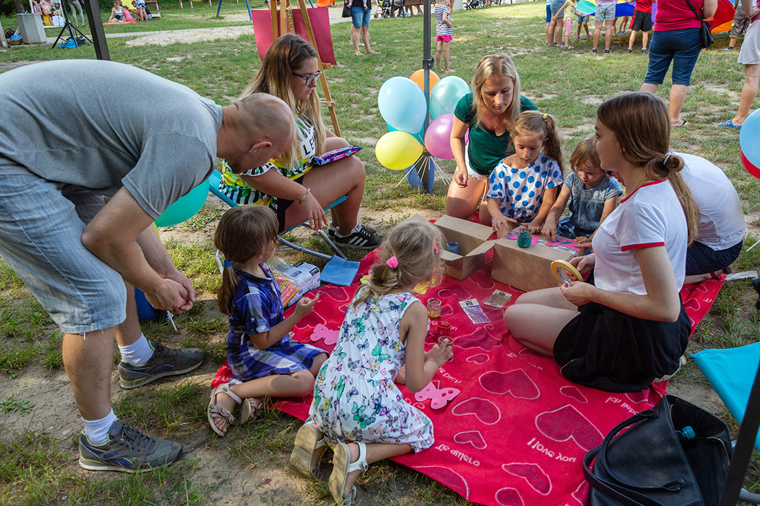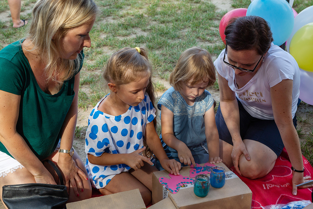– Blisko Darii jest Kinga, która ma motyle. Będziecie te motyle sami malować i dekorować. Odważni będą mogli zrobić to palcem zamoczonym w słoiczku z farbą. Jeżeli ktoś nie chce palcem, dostanie mały patyczek, którym będzie mógł udekorować swojego motyla. Te motyle są dla was. Zabieracie je ze sobą – zachęcała Kasia Wojnarowska. – Dalej jest stoisko Laury. Tam jest konkurencja dla was i dla waszych rodziców. Będziecie musieli dopasować kostkę do planszy, jaki to jest kolor. Najlepiej w parach, można zrobić wyścig na czas, sprawdzić swoja znajomość kolorów i koncentrację.