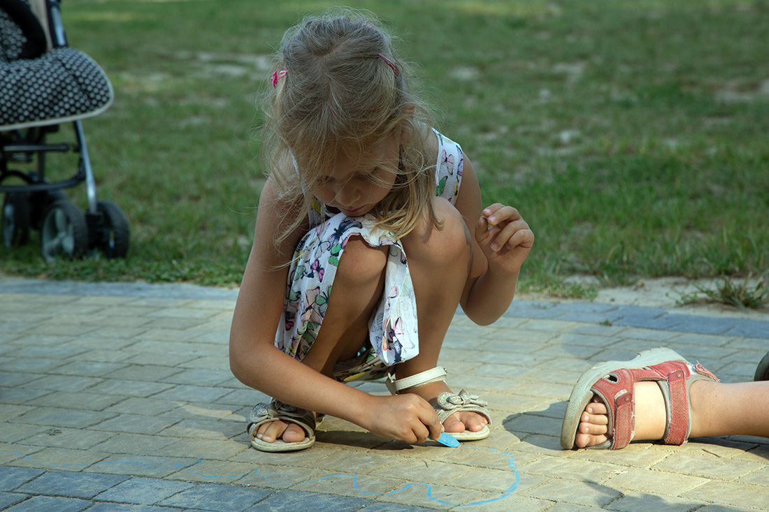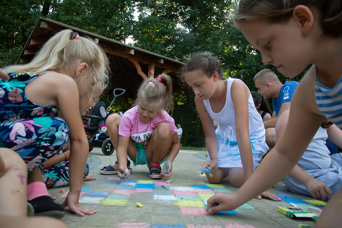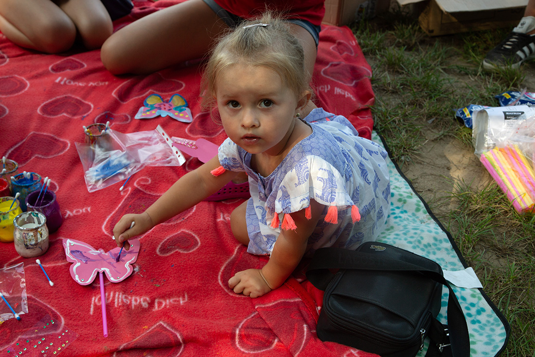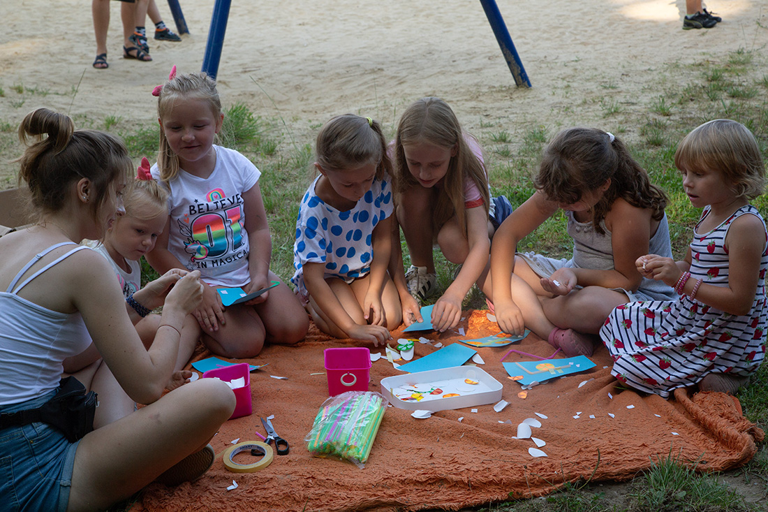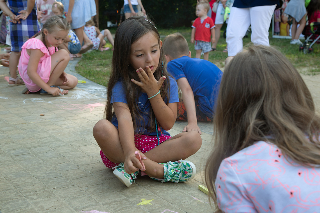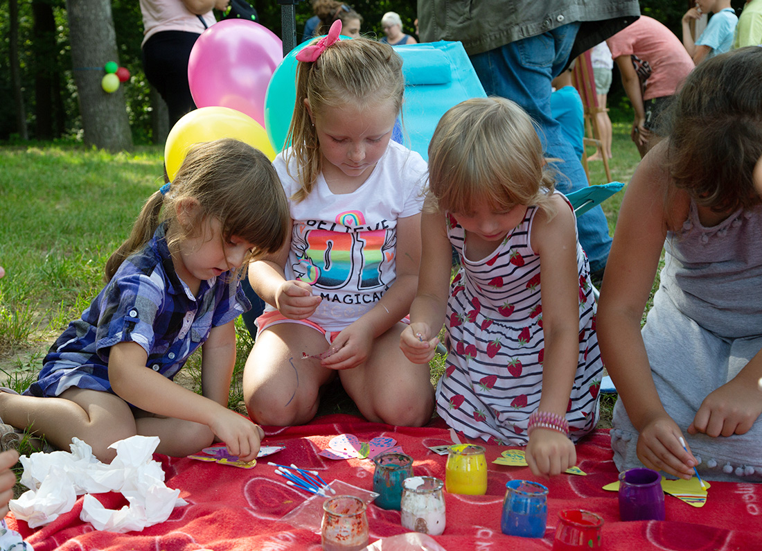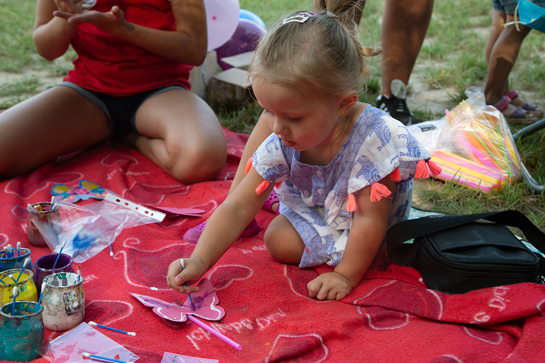 – Blisko Darii jest Kinga, która ma motyle. Będziecie te motyle sami malować i dekorować. Odważni będą mogli zrobić to palcem zamoczonym w słoiczku z farbą. Jeżeli ktoś nie chce palcem, dostanie mały patyczek, którym będzie mógł udekorować swojego motyla. Te motyle są dla was. Zabieracie je ze sobą – zachęcała Kasia Wojnarowska. – Dalej jest stoisko Laury. Tam jest konkurencja dla was i dla waszych rodziców. Będziecie musieli dopasować kostkę do planszy, jaki to jest kolor. Najlepiej w parach, można zrobić wyścig na czas, sprawdzić swoja znajomość kolorów i koncentrację.
