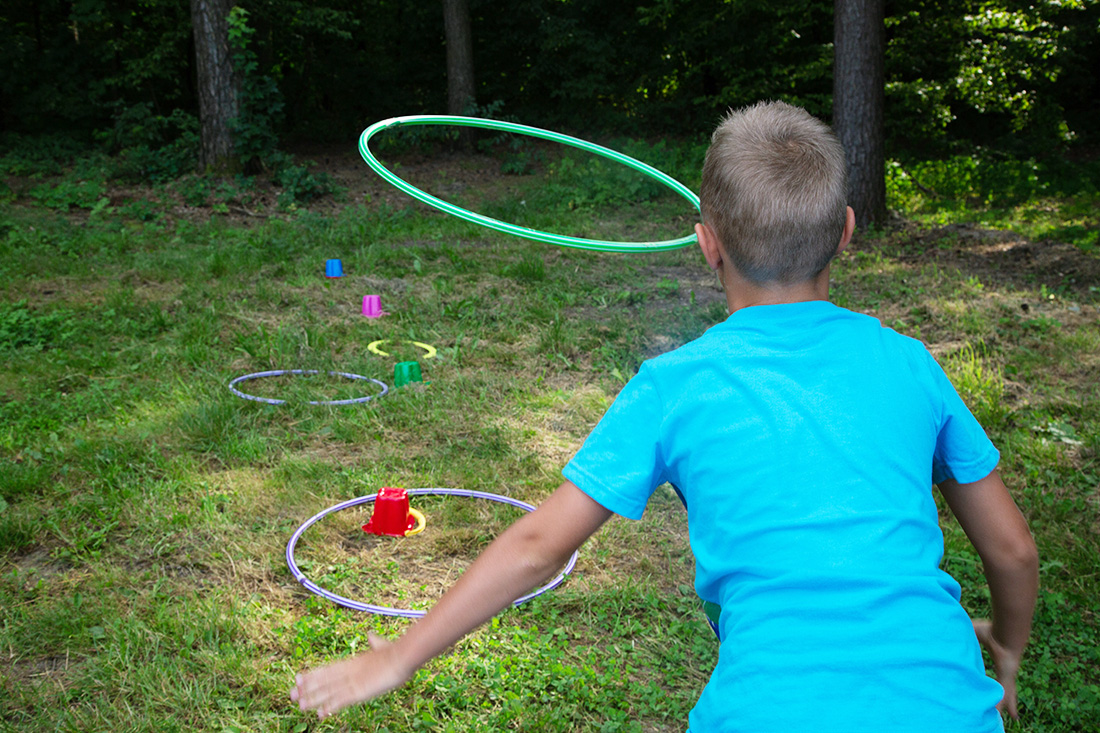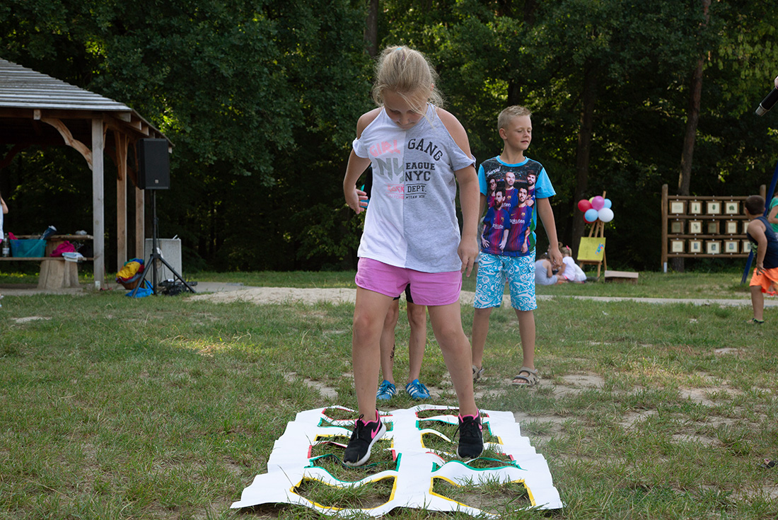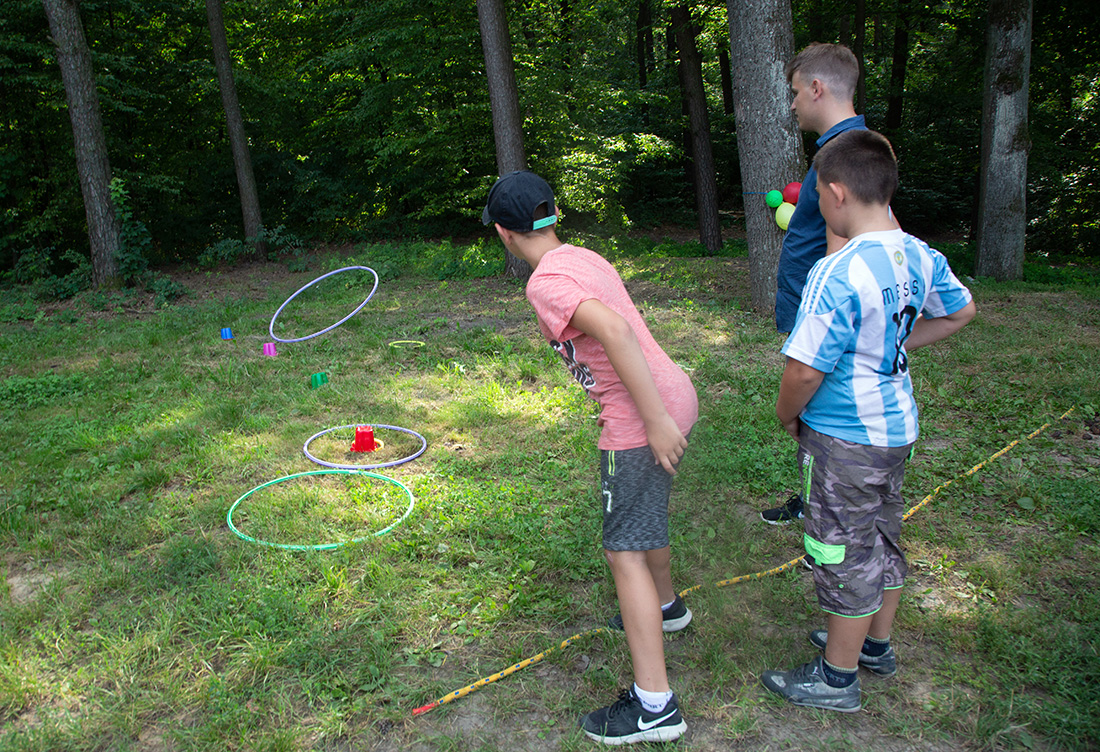 Na południowym krańcu polany, w Strefie Sokolego Oka, można było sprawdzić swoją celność, rzucając szyszkami do kolorowych baloników, przymocowanych do sosny. Można też było rzucać do przedmiotów kołem hula-hop. Tę konkurencję nadzorował Patryk.