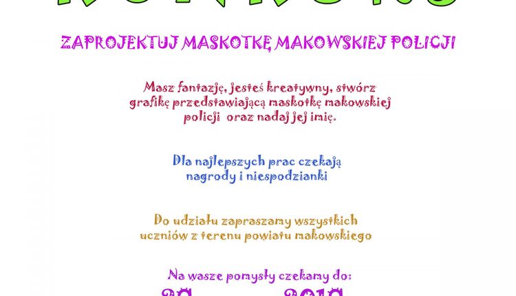 Masz fantazję, jesteś kreatywny, stwórz grafikę przedstawiającą maskotkę makowskiej policji oraz nadaj jej imię. Pracę prześlij wraz z Formularzem zgłoszeniowym – dostępny na stronie makowskie policji – http://www.mazowiecka.policja.gov.pl/wma/aktualnosci/27487,Konkurs-na-projekt-maskotki-makowskiej-policji.html