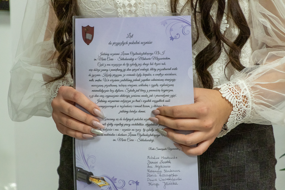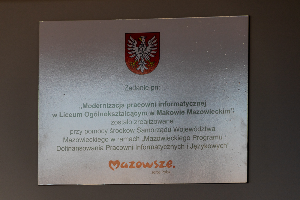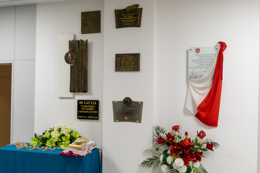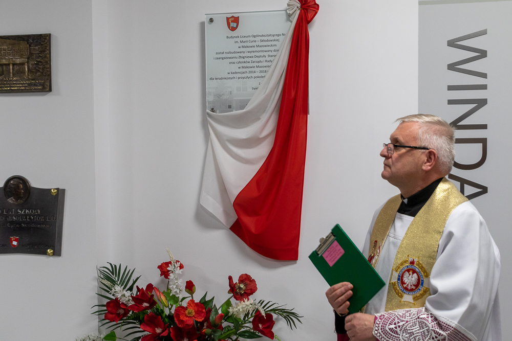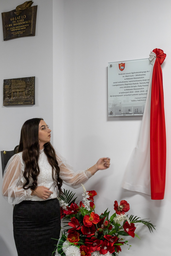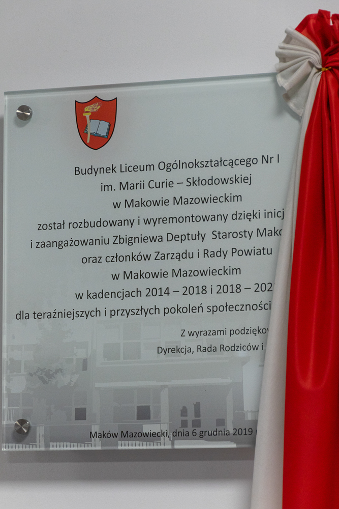 Następnie odsłonięta została tablica pamiątkowa z napisem: „Budynek Liceum Ogólnokształcącego nr 1 im. Marii Curie-Skłodowskiej został rozbudowany i wyremontowany dzięki inicjatywie i zaangażowaniu Zbigniewa Deptuły, Starosty Makowskiego oraz członków Zarządu i Rady Powiatu w Makowie Mazowieckim w kadencjach 2014-2018 i 2018-2022 dla teraźniejszych i przyszłych pokoleń społeczności. Z wyrazami podziękowania Dyrekcja, Rada Rodziców i uczniowie”.