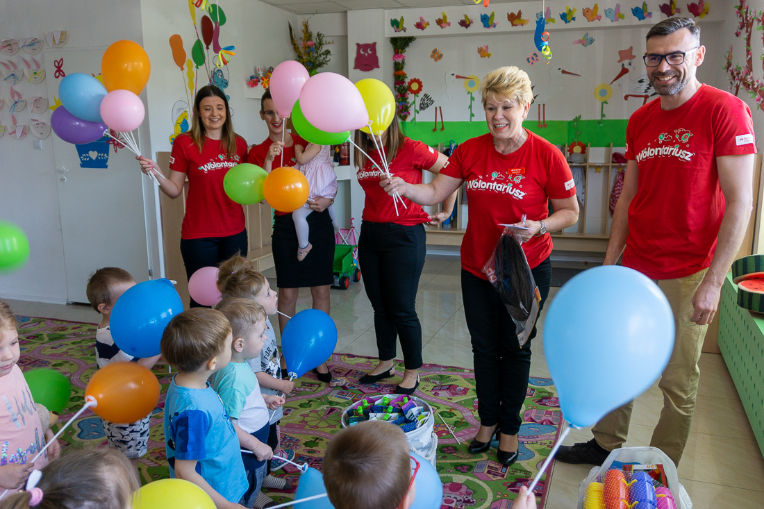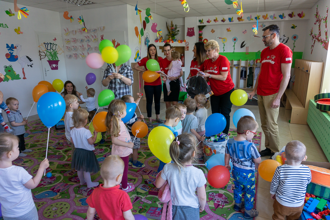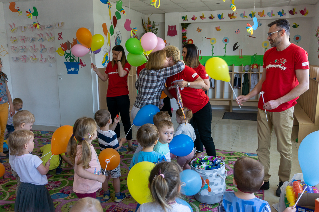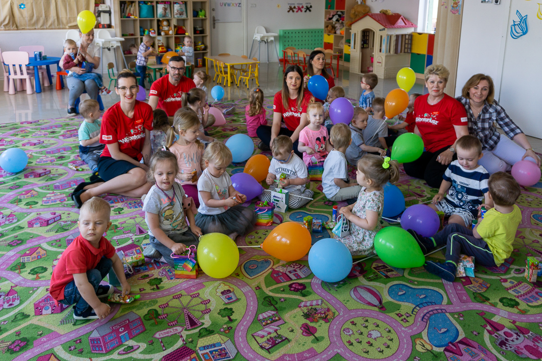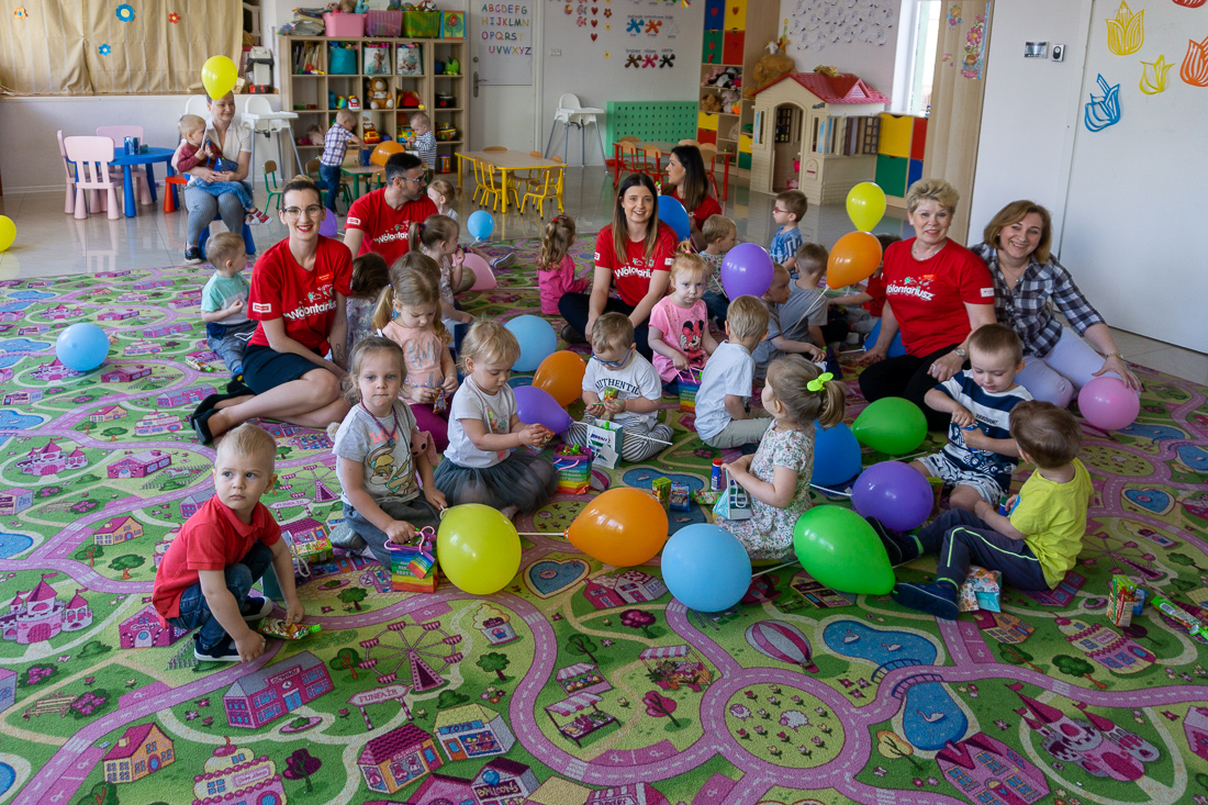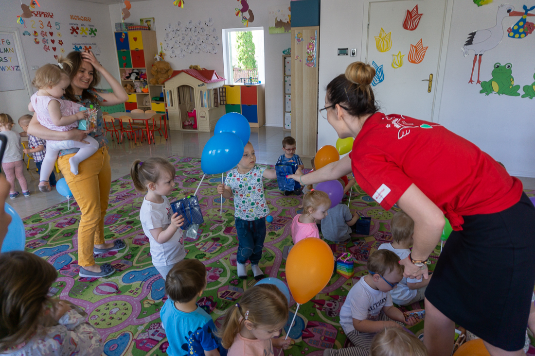 Obładowani prezentami weszli wczesnym rankiem do wypełnionej maluchami sali zabaw. Dzieciaki obserwowały panie w czerwonych koszulkach najpierw z zaskoczeniem, a za chwilę – gdy dowiedziały się, że to prezenty dla nich – z uśmiechami i nieskrywaną radością.