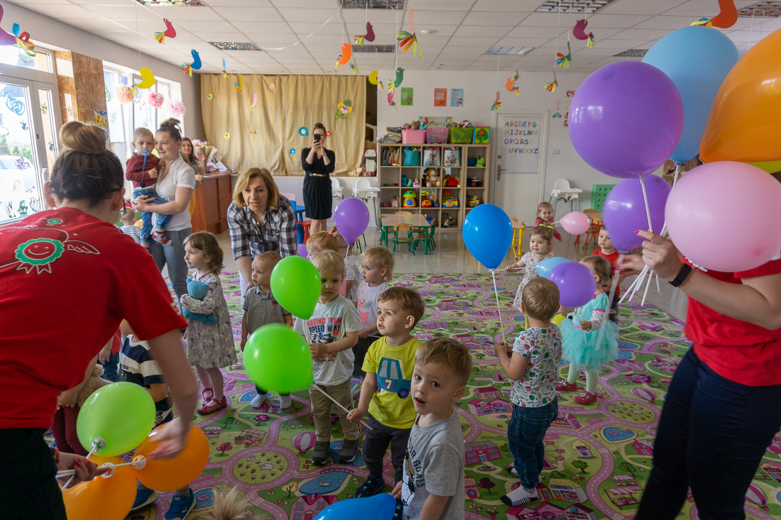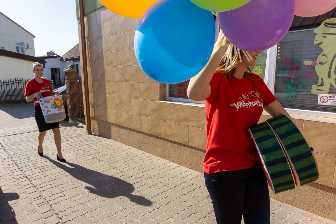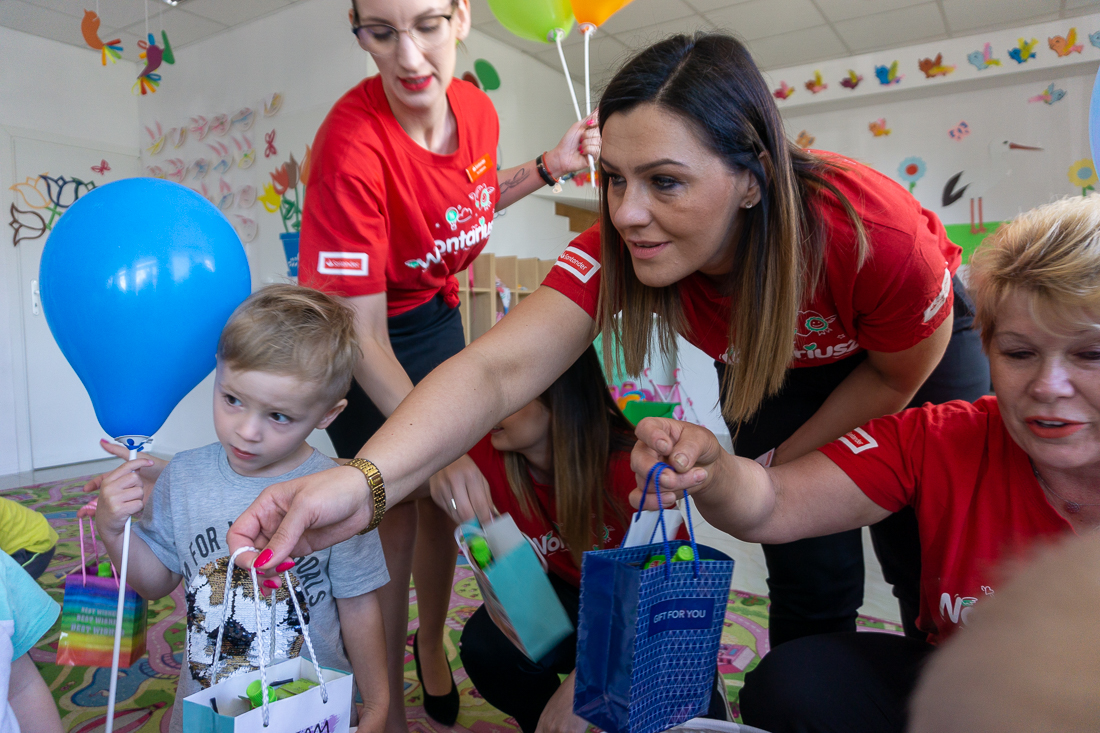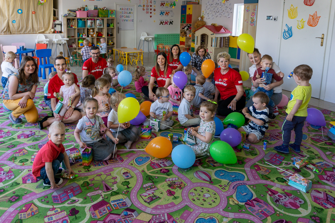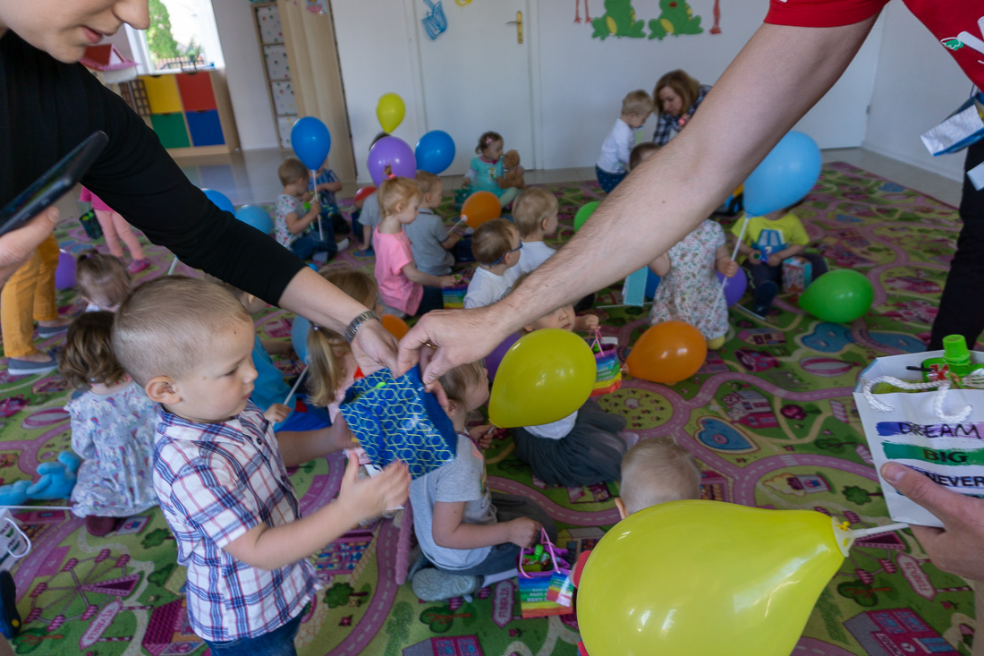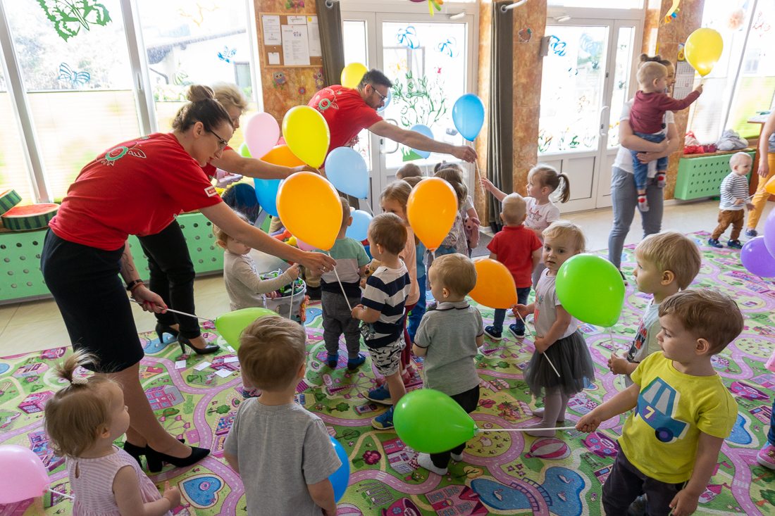 Obładowani prezentami weszli wczesnym rankiem do wypełnionej maluchami sali zabaw. Dzieciaki obserwowały panie w czerwonych koszulkach najpierw z zaskoczeniem, a za chwilę – gdy dowiedziały się, że to prezenty dla nich – z uśmiechami i nieskrywaną radością.