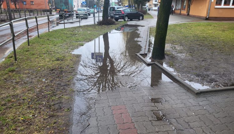 Spacerujący ulicą Mickiewicza, w pobliżu Jubilatki i PZU, napotkają na dużą kałużę, która powstała w wyniku roztopów i opadów deszczu. Wody jest sporo a trawnik obok także mokry więc szczególnie kobiety mają problem z przejściem.