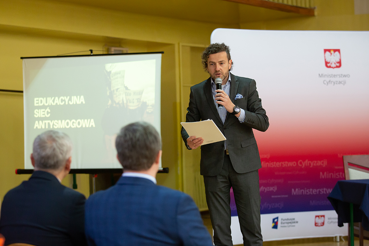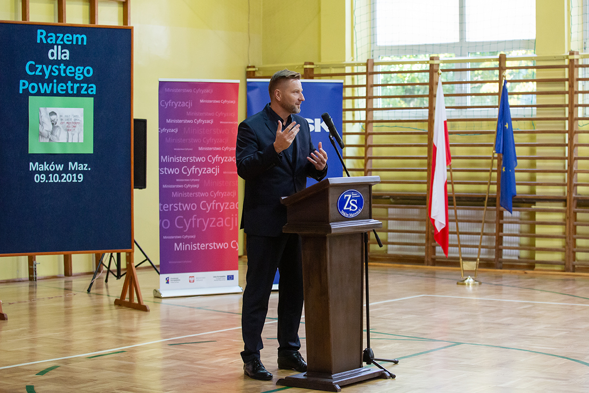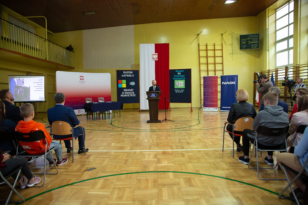 – Chcemy żeby program się rozwijał – powiedział Bartłomiej Klinger, zastępca dyrektora NASK. – Dlatego w waszej szkole zaczynamy akcję „Program dla powietrza”. Będziemy starali się zaangażować w tę akcję szerokie grono podmiotów zainteresowanych czystym powietrzem i tych, którzy mają pieniądze, czyli przedsiębiorców zarówno lokalnych, jak i globalnych, samorządy.
