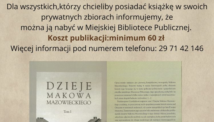„Jeszcze cieplutka, wprost z drukarni trafiła do nas Pierwsza kompleksowa Monografia Makowa Mazowieckiego, która już niebawem będzie do wypożyczenia w Bibliotece Miejskiej przy ul. Stanisława Moniuszki – zapraszamy”.