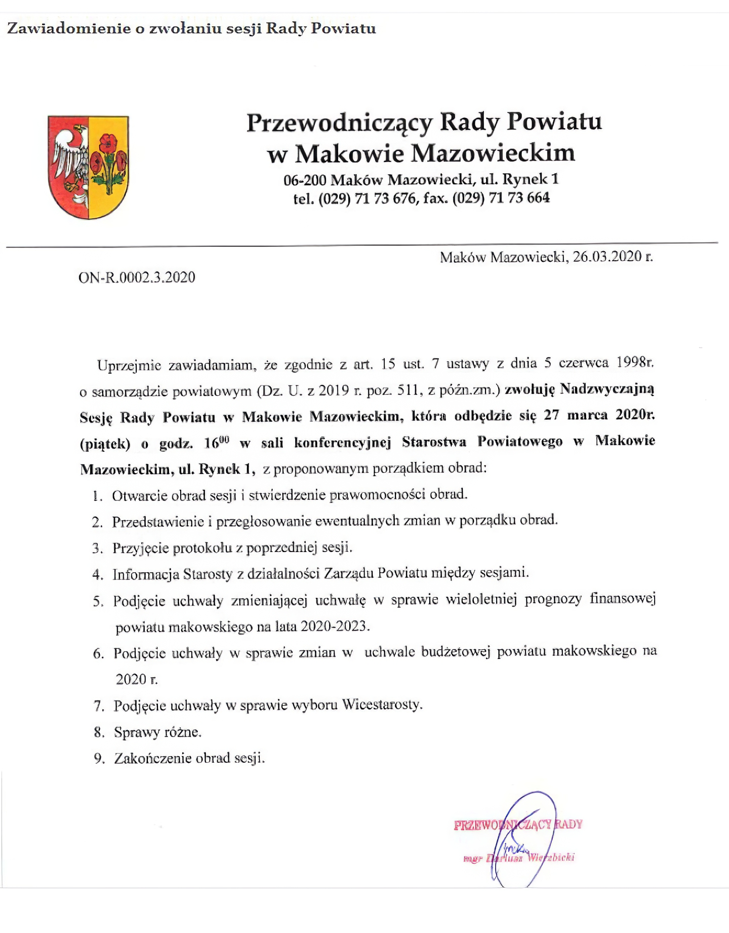 W piątek 27 marca odbyła się nadzwyczajna sesja Rady Powiatu w Makowie Mazowieckim.