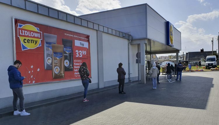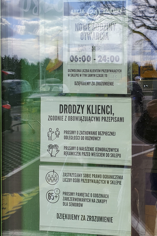 Kolejki przed sklepami, widok którego nie znają młodzi ludzie, powróciły. Jest spokojniej niż w latach 80., bo wszyscy wiedzą że towarów nie zabraknie. Czekać przed sklepami trzeba tylko dlatego, że wewnątrz sklepu może przebywać jednocześnie tylko 3 klientów na jedną kasę. Dla Biedronki przy Przasnyskiej oznacza to limit 15 osób, dla Lidla przy tej samej ulicy tylko 12.