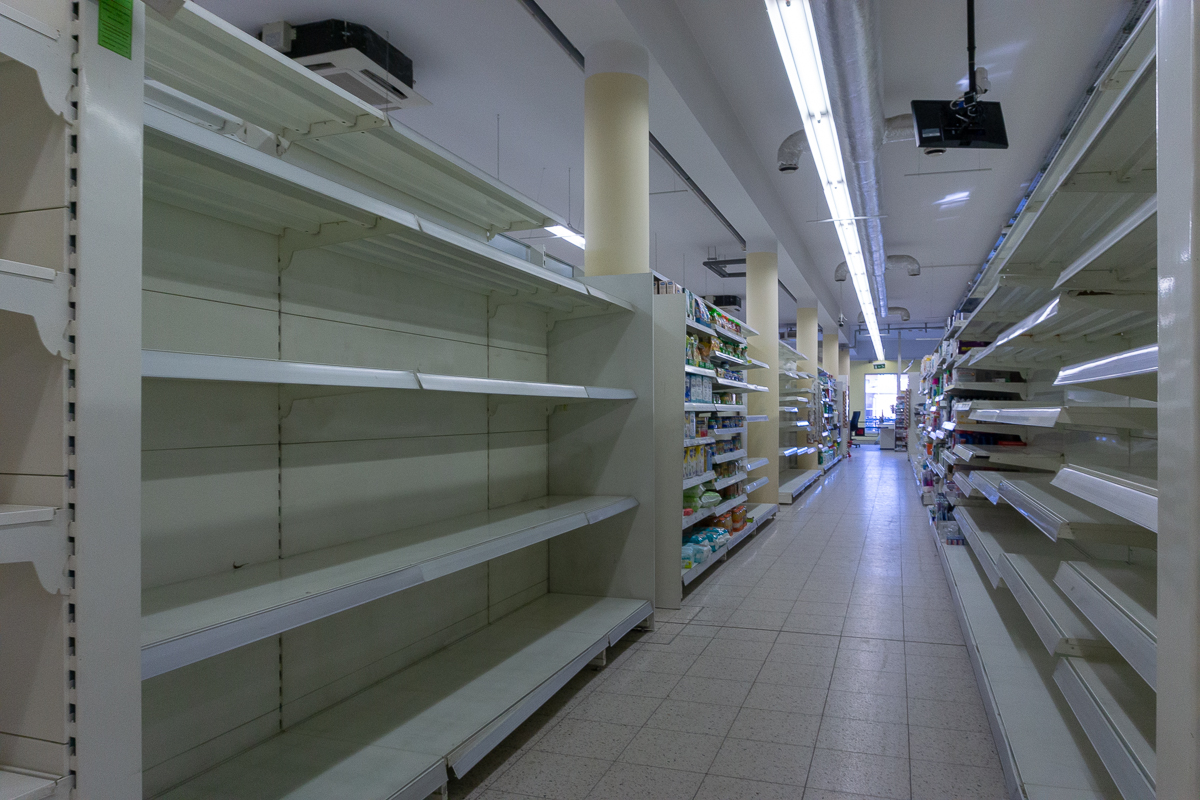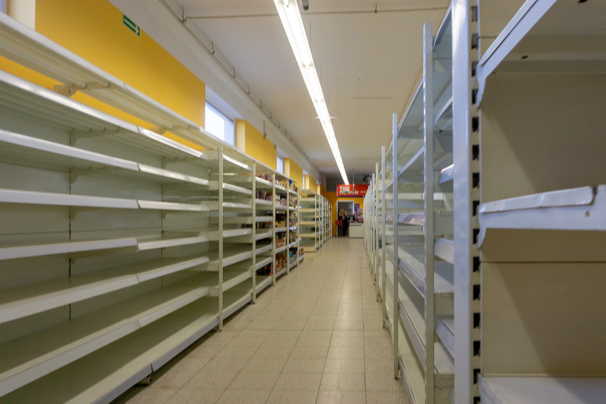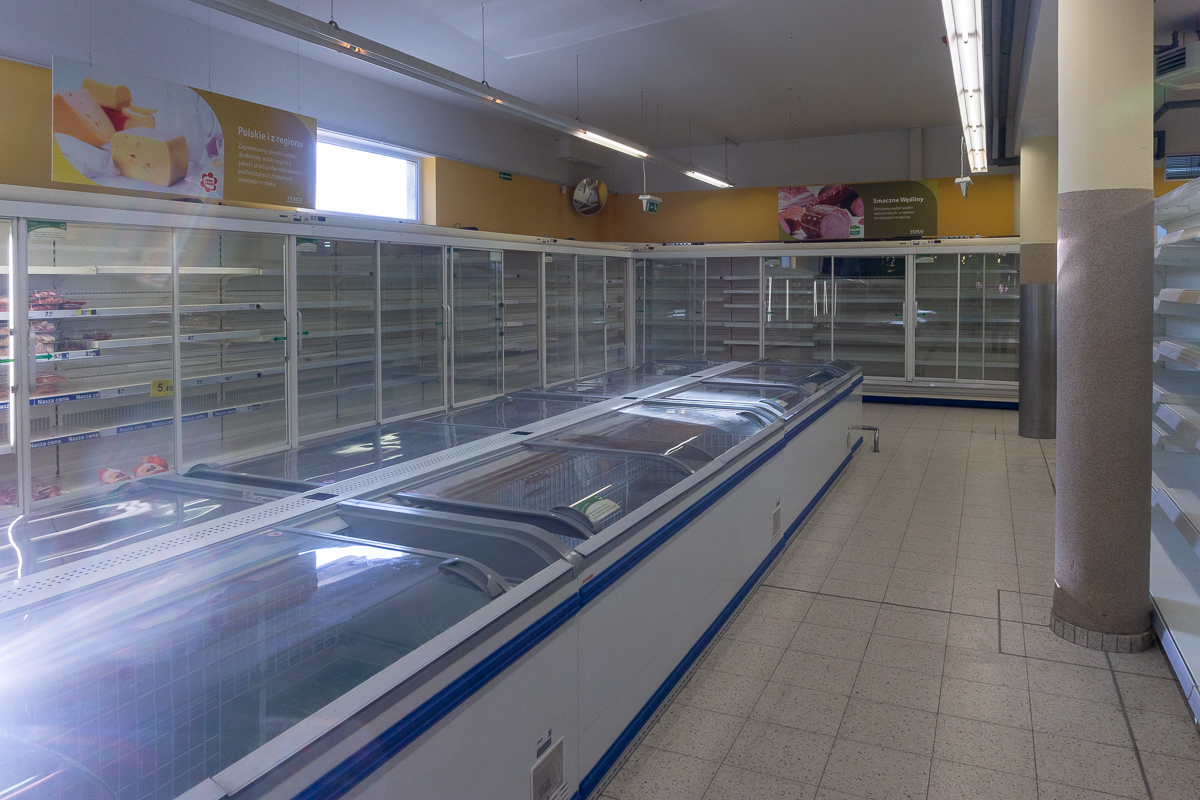 Puste półki, dwoje klientów – tak wyglądał sklep Tesco na 3 dni przed ostateczną likwidacją. Przed wejściem pożegnalna tablica.