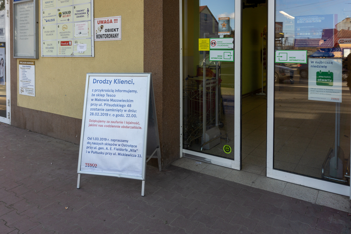 „Drodzy Klienci, z przykrością informujemy, że sklep Tesco w Makowie Mazowieckim przy ul. Piłsudskiego 48 (powinno być – Pułaskiego – przyp. red.)zostanie zamknięty w dniu 28.02.2019 r. o godz. 22:00. Dziękujemy za zaufanie i lojalność, jakimi nas codziennie obdarzaliście.Od 1.03.2019 r. zapraszamy do naszych sklepów w Ostrołęce i Pułtusku.Tesco”.
