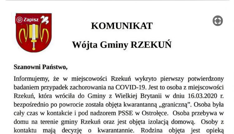 Informujemy, że w gminie Rzekuń wykryto pierwszy potwierdzony badaniem przypadek zachorowania na COVID-19. Jest to osoba z miejscowości Rzekuń, która wróciła do Gminy z Wielkiej Brytanii w dniu 16 marca 2020 roku, bezpośrednio po powrocie została objęta kwarantanną „graniczną”. Osoba była cały czas w kontakcie i pod nadzorem PSSE w Ostrołęce. Osoba przebywa w domu na terenie gminy Rzekuń oraz jest objęta izolacją domową. Osoby z kontaktu mają decyzję o kwarantannie. Rodzina jest objęta opieką odpowiednich służb, które monitorują stan zdrowia oraz dyscyplinę pozostawania w domu.