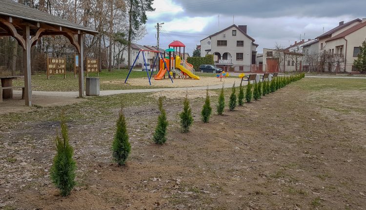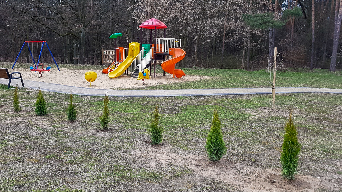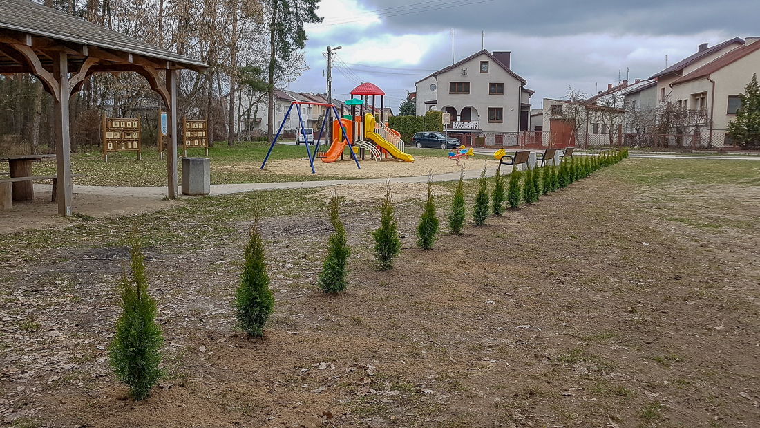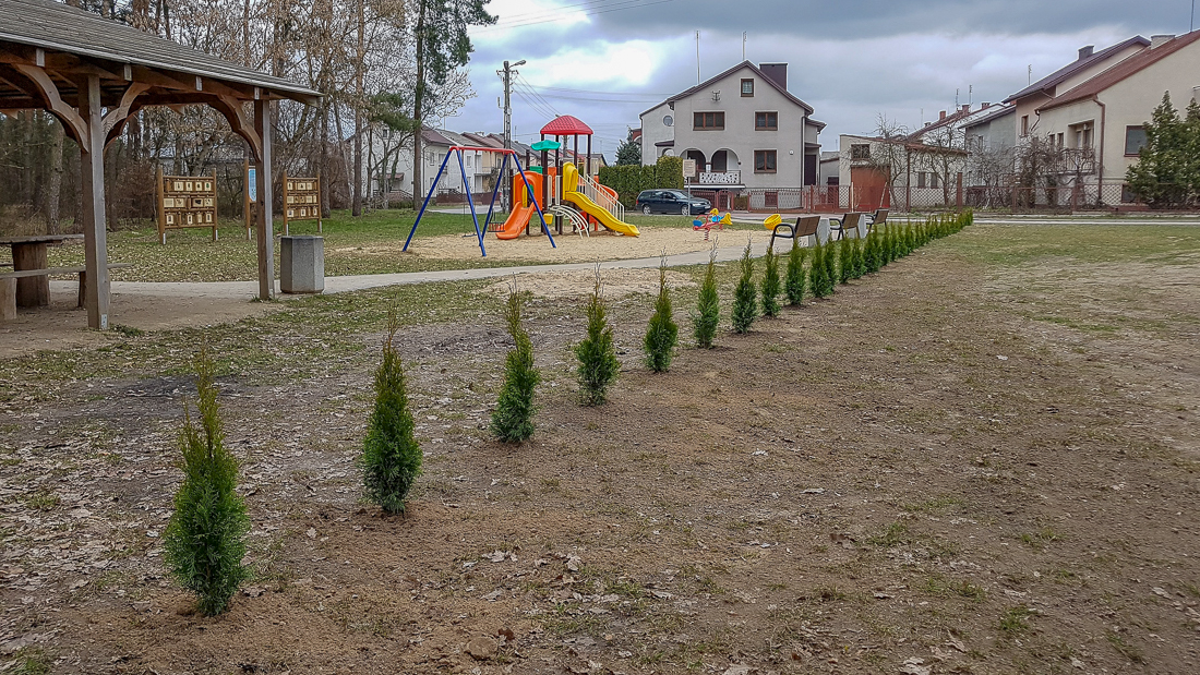 Tymczasem plac pięknieje. W ubiegłym tygodniu zostało tam posadzone 39 sadzonek tui. Gdy urosną, utworzą ładny szpaler oddzielający plac zabaw od części parkingowej.