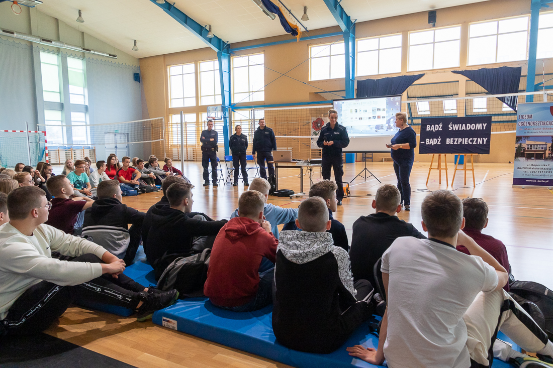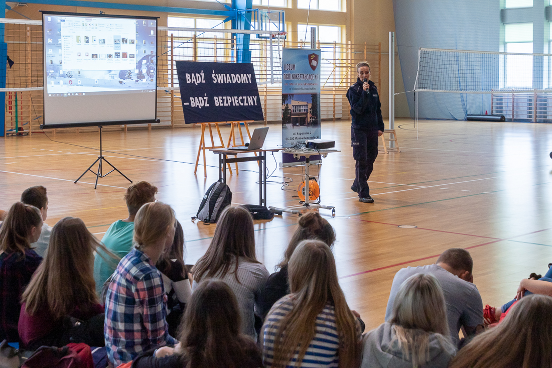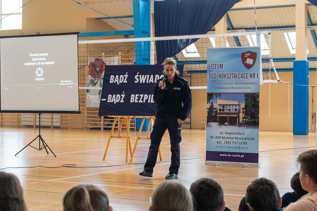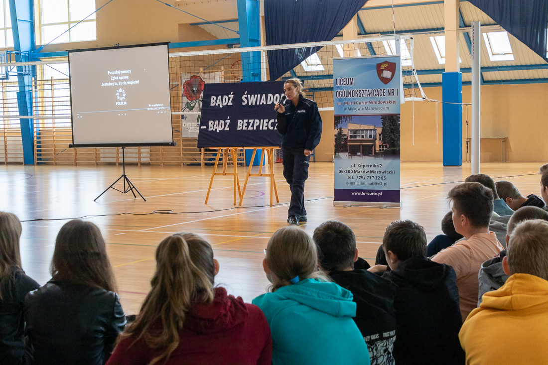 W czwartek 24.10. makowskie liceum odwiedził silny oddział policjantek i policjantów z całego kraju. Oddział liczył 19 funkcjonariuszek i funkcjonariuszy policji z całego kraju. Opanowali oni szkołę na całą godzinę lekcyjną. Spotkania z młodzieżą odbywały się w sali gimnastycznej i w salach lekcyjnych.