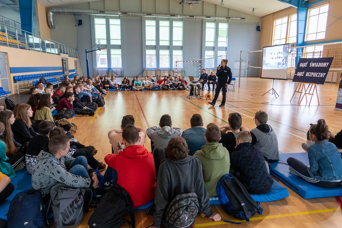 Hasło przewodnie spotkań policjantów z młodzieżą brzmiało: „Bądź świadomy, bądź bezpieczny”.