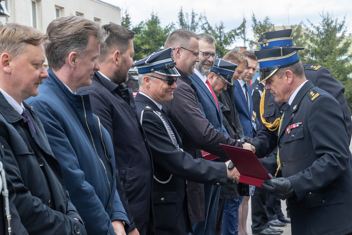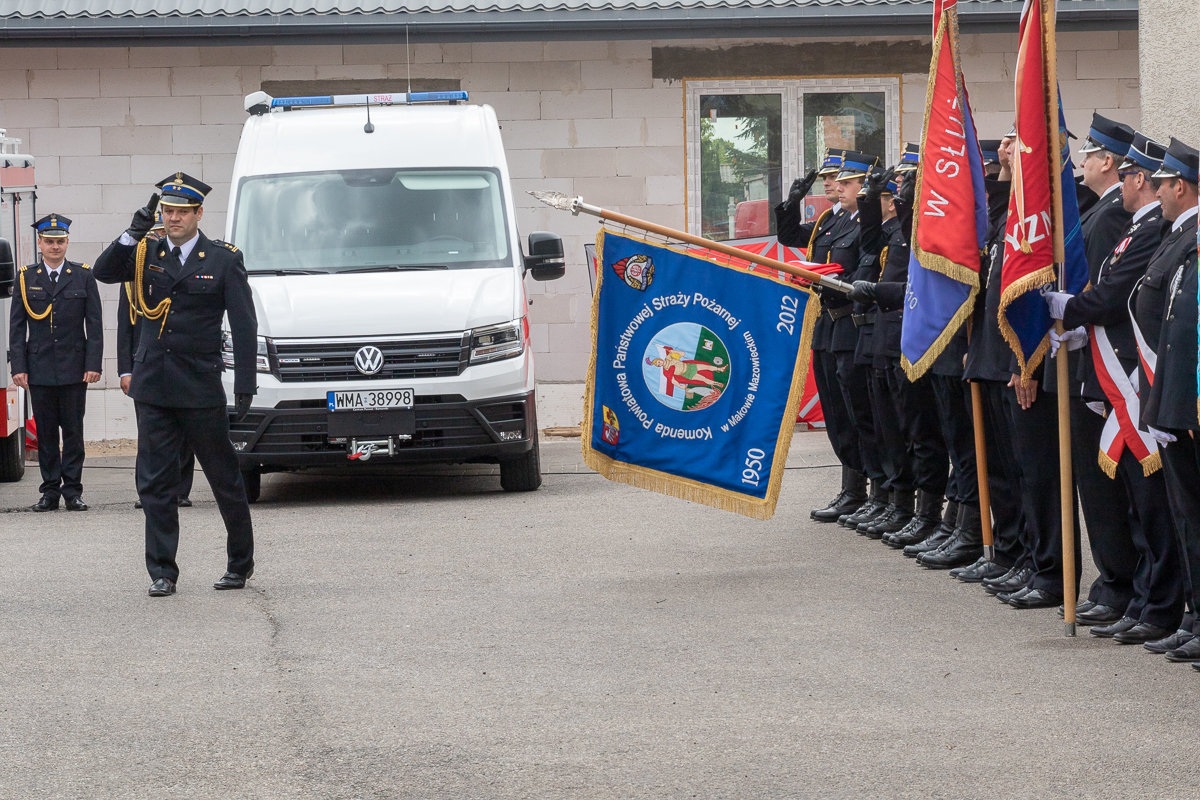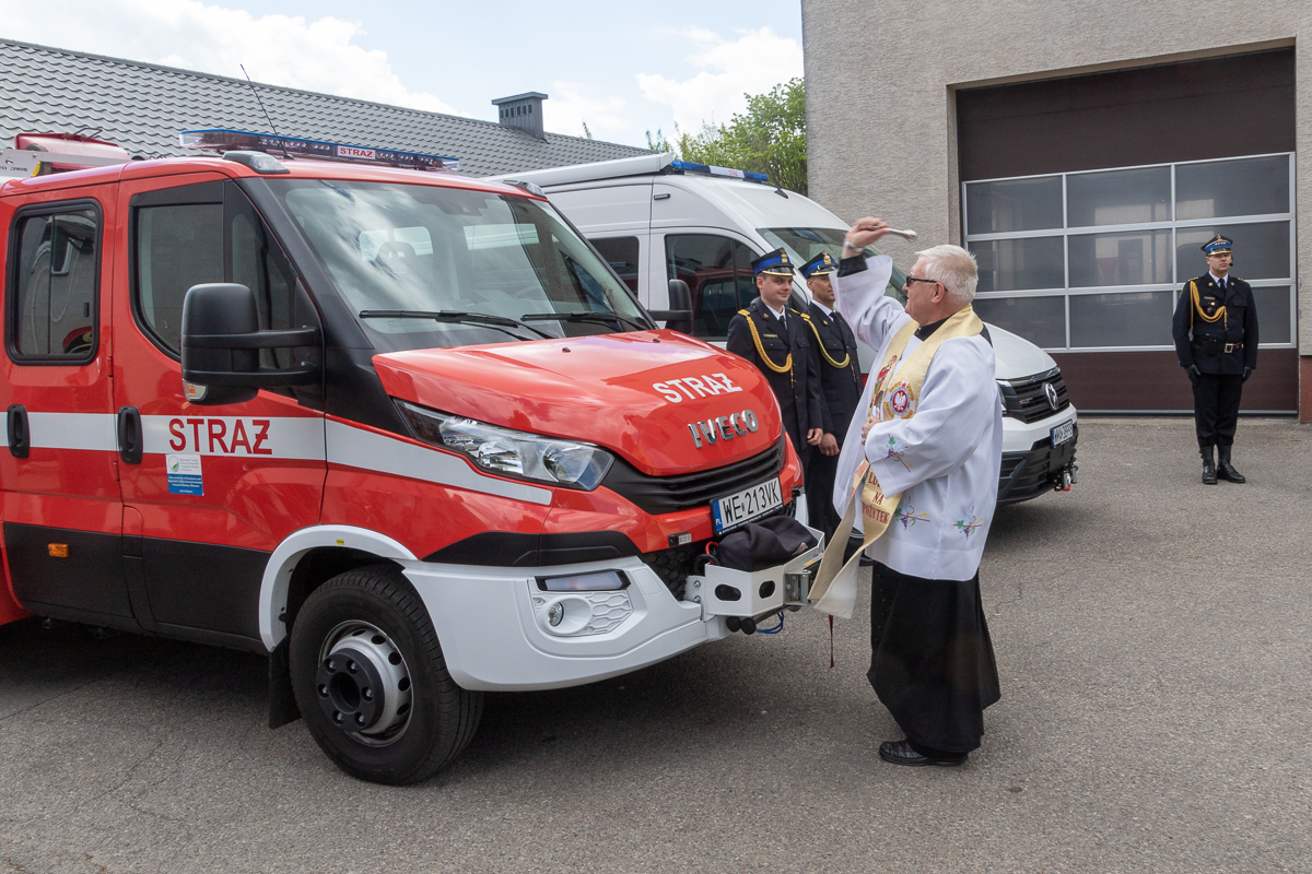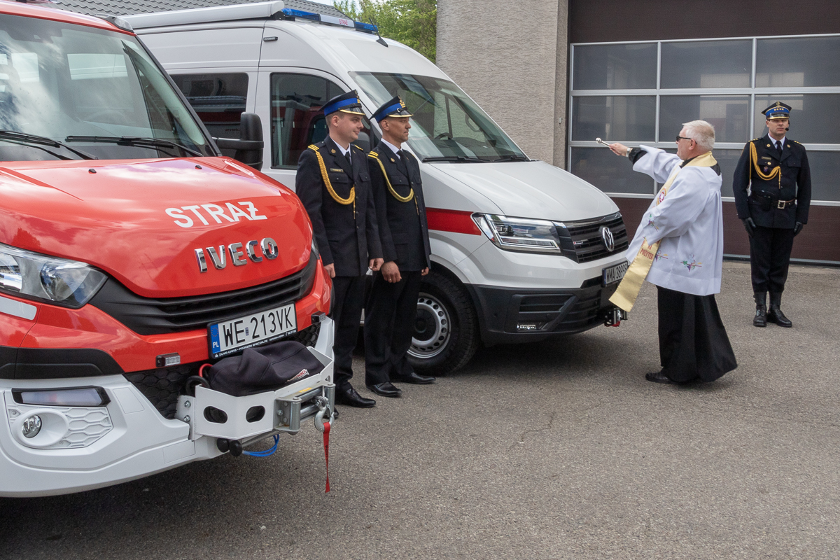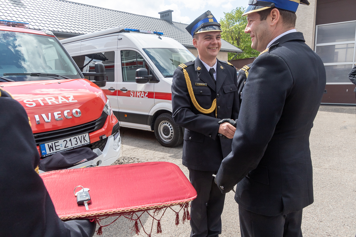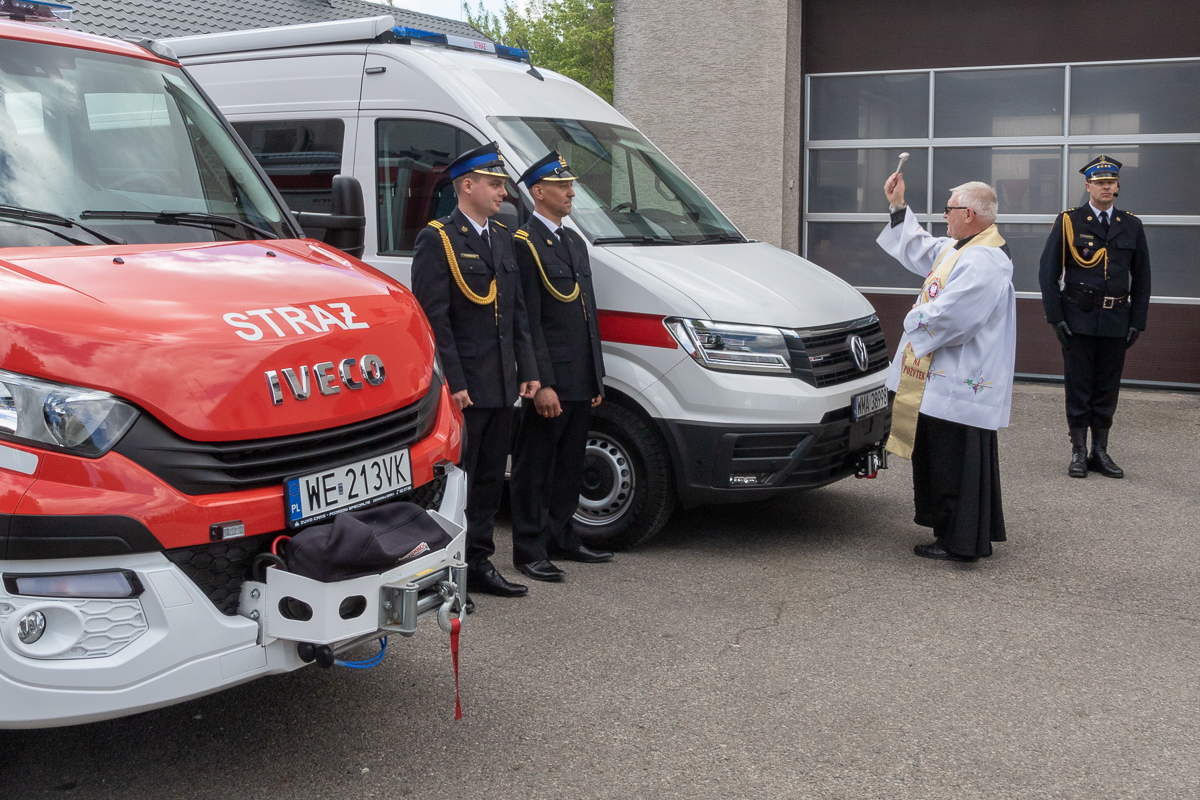 Kolejnym punktem uroczystości było wręczenie aktów przekazania oraz kluczyków do nowych samochodów. Aktu dokonali zastępca Mazowieckiego Komendanta Wojewódzkiego PSP w Warszawie bryg. Artur Gonera i Komendant Powiatowy PSP w Makowie Mazowieckim st. bryg. Arkadiusz Gołębiewski. Następnie ks. kan. Stanisław Dziekan poświęcił pojazdy, po czym kierowcy uruchomili na chwilę silniki i syreny strażackie.