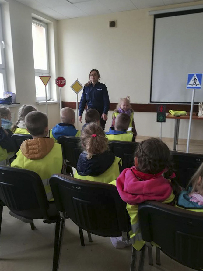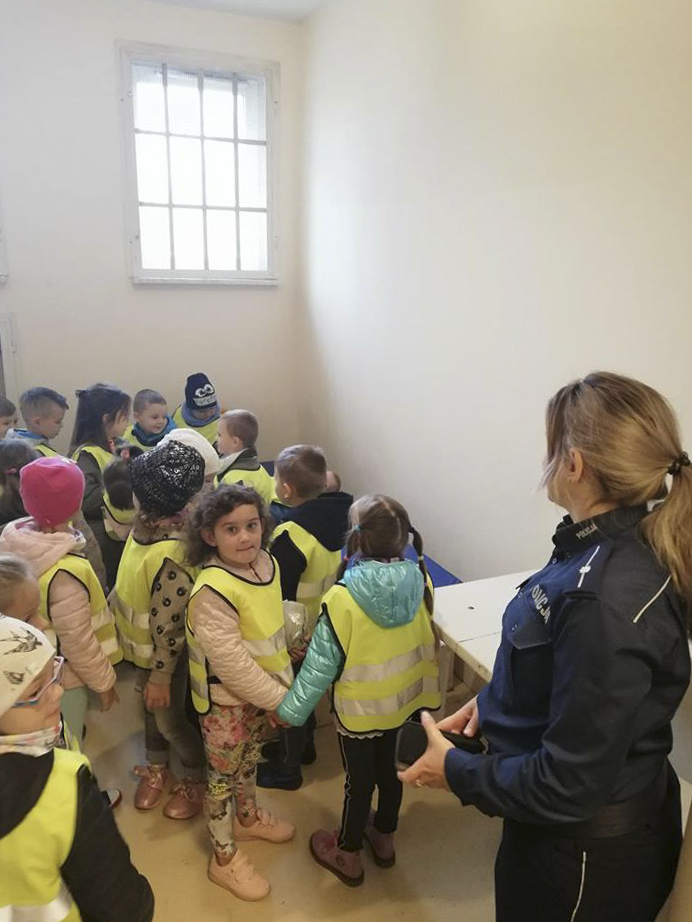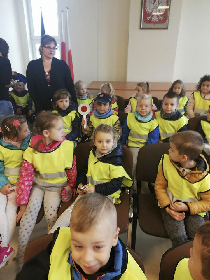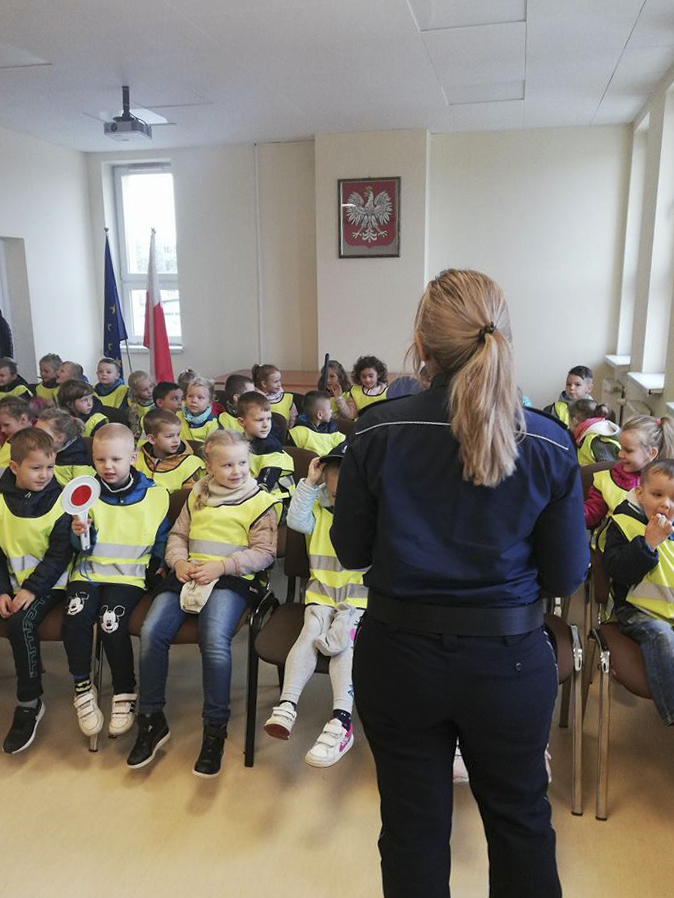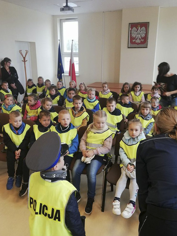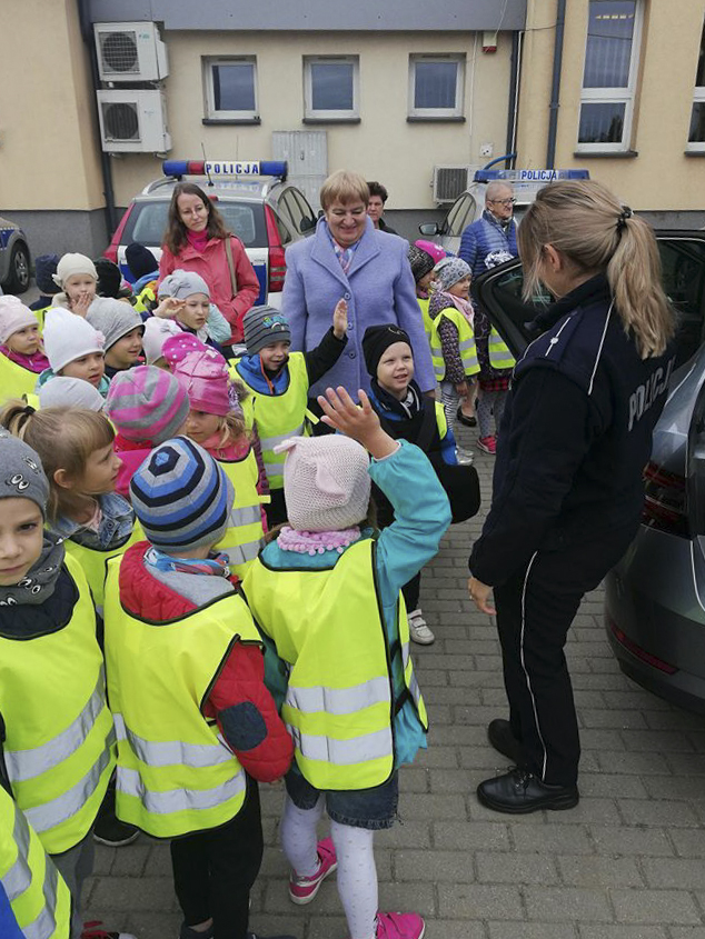 Wizytę rozpoczęto od spotkania z I Zastępcą Komendanta Powiatowego Policji w Makowie Maz. nadkom. Sławomirem Królakiem. Później dzieci wysłuchały pogadanki na temat bezpieczeństwa i z bliska mogły zobaczyć policyjne wyposażenie do służby. Największym zainteresowaniem cieszył się policyjny radiowóz, do którego można było wsiąść i włączyć sygnały. Na koniec dzieci otrzymały od policjantów odblaski.
