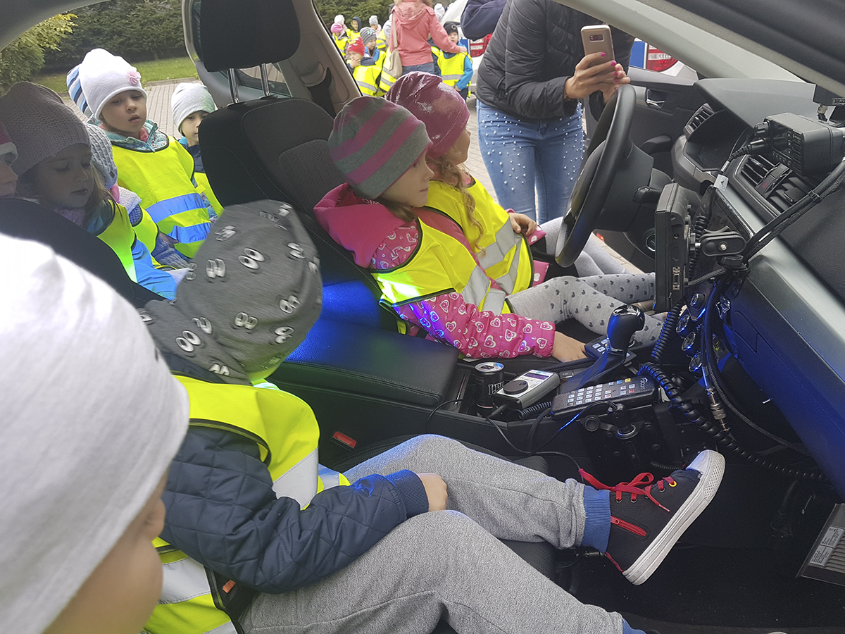 Dzieciaki bardzo serdecznie powitały gości i z zaciekawieniem słuchały pogadanki z zakresu bezpieczeństwa. Szczególnym zainteresowaniem wśród dzieci cieszyła się prezentacja wyposażenia policyjnego, które jest niezbędne podczas wykonywania pracy. Największą jednak atrakcją była możliwość zwiedzenia samochodu policyjnego, nie tylko od zewnątrz ale i „od środka”. Aby bardziej przybliżyć tematykę bezpieczeństwa dzieciom policjanci rozdali kolorowanki promujące bezpieczne zachowania.