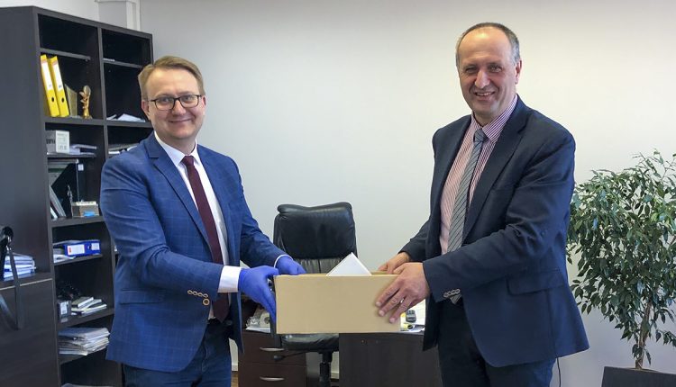 Na zdjęciu: radny Rafał Barański (L) przekazuje zakupione za dietę maseczki dyrektorowi Jerzemu Wielgolewskiemu, 01.04.2020 r.
