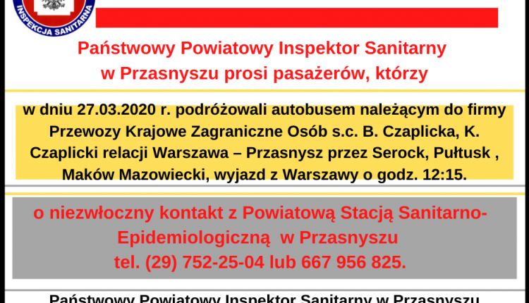 Pasażerowie autobusu proszeni są o kontakt z Powiatową Stacją Sanitarno-Epidemiologiczną w Przasnyszu – tel. (29) 752-25-04 lub 667 956 825.