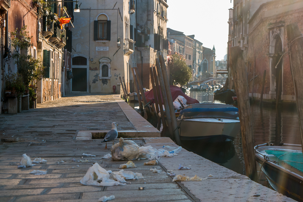 W Wenecji na lagunie jest inaczej. Ponieważ miasto jest gęsto zaludnione i gęsto zabudowane, mieszkańcy zawsze odmawiali kontenerów na śmieci, ponieważ byłyby zbyt blisko ich domów, szkół, sklepów itp.