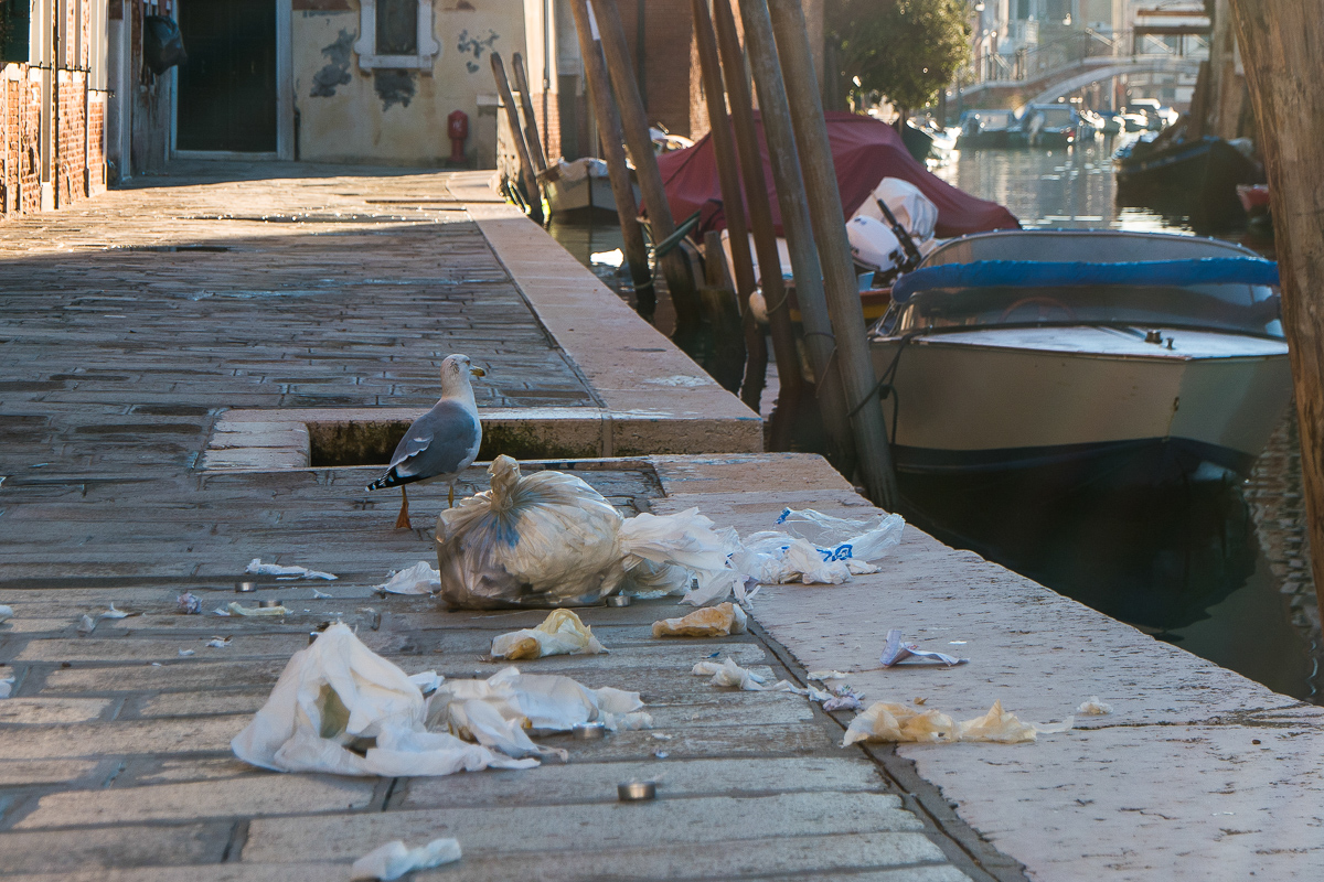 Do ubiegłego roku śmieci były układane za drzwiami i zbierane przez pracowników zakładu oczyszczania miasta. Jednak mewy weneckie stały się bardziej żarłoczne i zaczęły rozrywać wszystkie pojedyncze worki na śmieci pozostawione bez nadzoru. W rezultacie codziennie rano ulice i sąsiednie kanały w Wenecji były pokryte śmieciami.