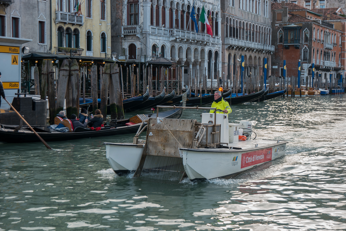 Śmieci są ręcznie odbierane przez pracowników komunalnych i wkładane do ich wózków. Wozy są pchane ręcznie po mieście, przez liczne mosty i mostki. Gdy są pełne, są opróżniane do łodzi śmieciarek, które są przycumowane przy nadbrzeżach szerszych kanałów. Następnie – po zapełnieniu – łodzie odpływają na wyspę Sacca Fisola. Stamtąd śmieci zabierane są (też łodziami) na stały ląd w celu recyklingu. Bardzo mała część odpadów, których nie można poddać recyklingowi ani przetworzyć w celu wytworzenia paliwa stałego, kończy na wysypisku śmieci na lądzie stałym.